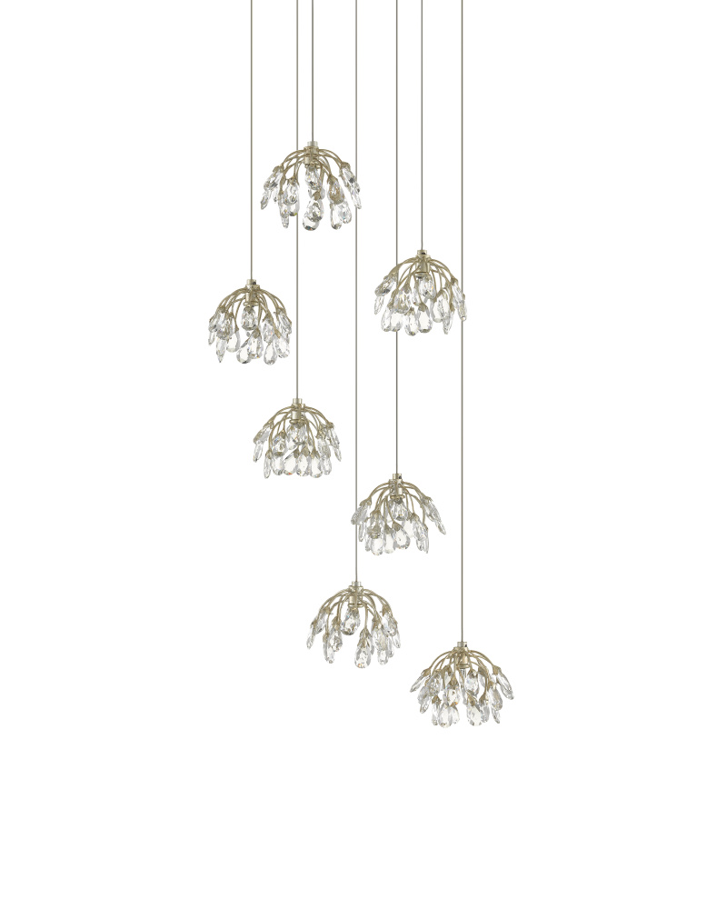 The Crystal Bud 7-Light Multi-Drop Pendant dangles flowers made of delicate faceted crystals from its canopy to make the shades effervescent and graceful. The canopy of this piece is luminous in a painted silver finish. This fixture is among Currey & Company's multi-drop pendant collection, which includes multiple configurations.