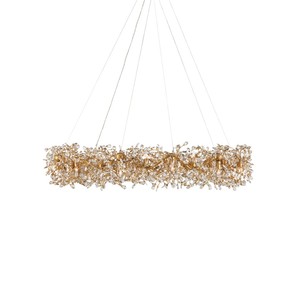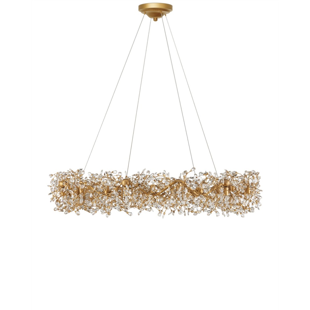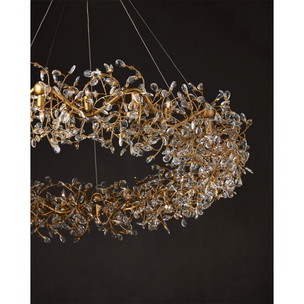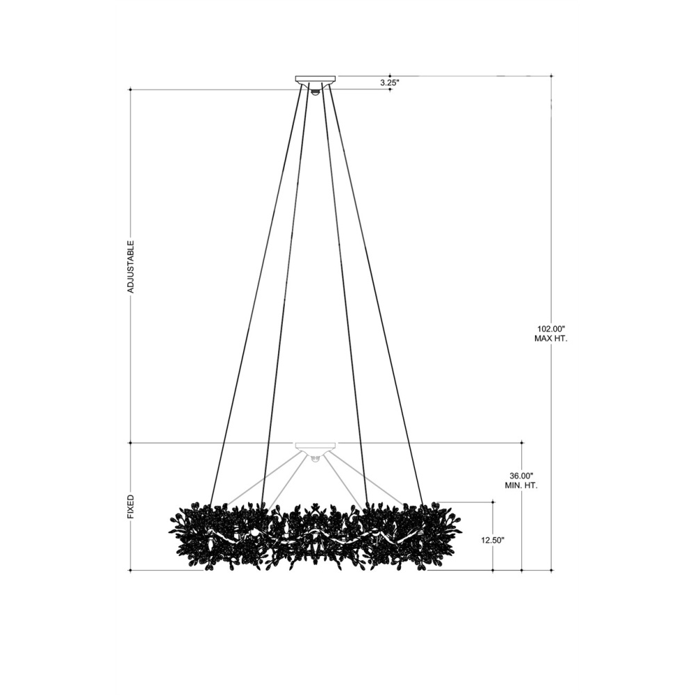 The Crystal Bud Grande Ring Chandelier has delicate faceted crystals unfurling from vines that flow around the fixture. The gleaming metal in a brass finish serves as a warm contrast to the luminous crystals; the interplay making the profile of this fixture complex and interesting. This stunning crystal chandelier is nearly 50 inches in diameter and the lights alternate pointing up and down to increase the sparkle and the luxurious aura. Adjustable from 36" to 102" with use of included chain/rod kit/cable. If your space calls for a longer drop, additional chain/rods/cable is available for purchase.