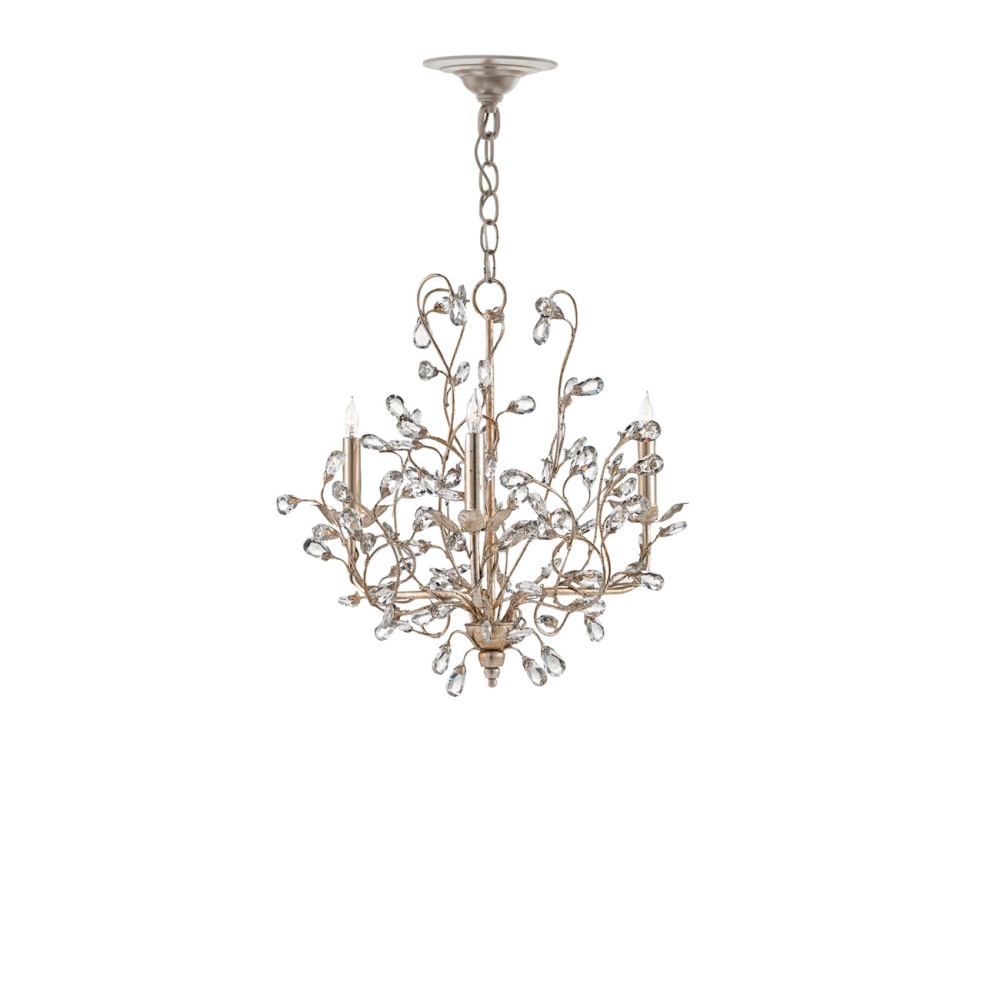 The pleasing attributes of nature merge with the conventions of finely crafted traditional design in the silver version of our romantic Crystal Bud Chandelier in a small size. Delicate faceted crystals unfurl from the silver Granello-finished vines that make up the flowing profile of this idyllic piece. The three-light chandelier is one of the fixtures in the Crystal Bud family of lights.