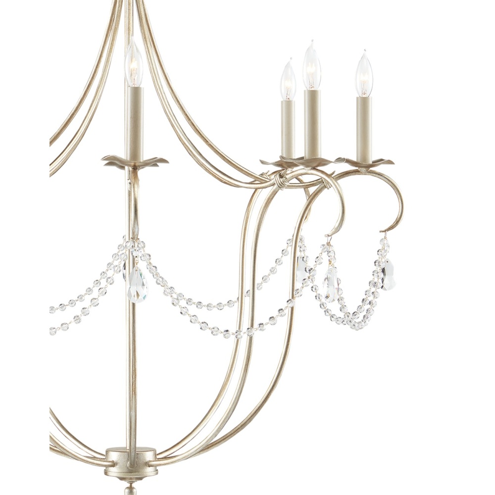 The large version of our Crystal Lights Chandelier flaunts its jewelry fittingly, as its beads are far from mere ornamentation: they are essential to the heart of this design. The crystals swag between elegant wrought-iron spokes that curl daintily at the ends. Wires bind the curling supports to those cascading from the canopy for added cohesion in the design details, all treated to a silver leaf finish. We see the fixture with its eight candelabra bulbs as the perfect bauble for the glamorous dining room or living room.