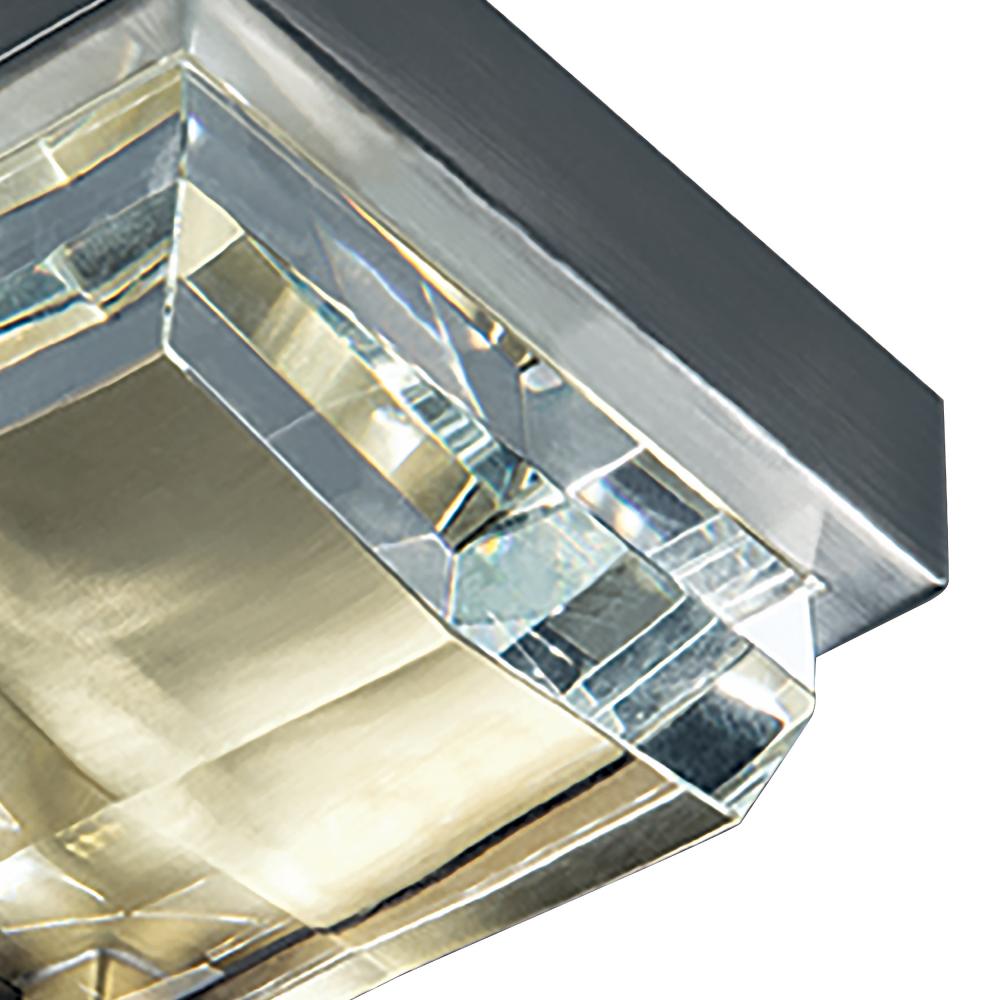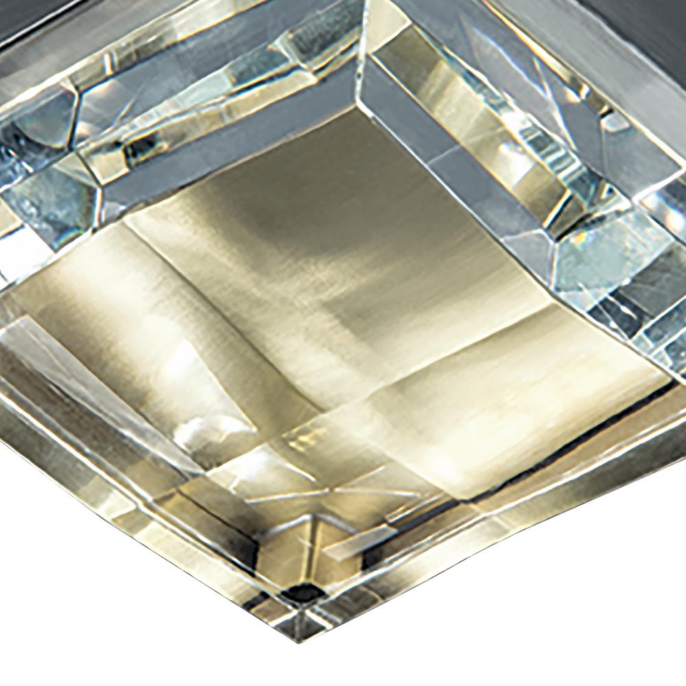 This transitional flush mount features a small-scale width of just 6 3/8 inches square. The stunning faceted crystal glass is 2 inches thick. The Brushed Nickel and Satin Brass compliment the glass perfectly. This fixture can be used both by itself and in multiple groupings.