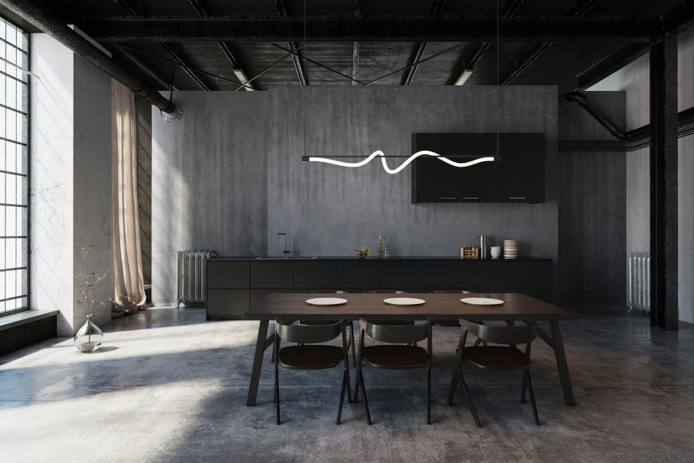 The Cursive linear pendant is a fluid signature of light, formed by an effortless acrylic form dancing around a center rod, suspended by two cables. Available in a black metal finish, this pendant offers soft ambient light diffused by a frosted lens.