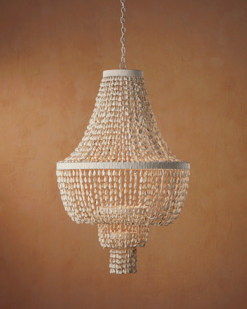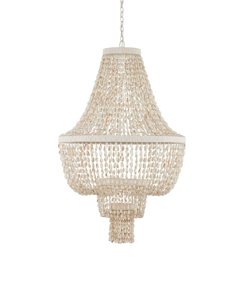 The graceful Cybele Chandelier is an artistic statement made of natural materials styled in a sophisticated way that transcends the humbleness of each of its building block. Natural shells are draped in the time-honored empire shape that has continued to be popular since the grand age of Hollywood Glamour. The wrought iron rings that support the swags are finished in pearlized white before being painstakingly wrapped in white paper twine. The paleness of both the finish and the twine tease out the lightest shades in the delicate shells. Adjustable from 65" to 156.5" with use of included chain/rod kit/cable. If your space calls for a longer drop, additional chain/rods/cable is available for purchase.