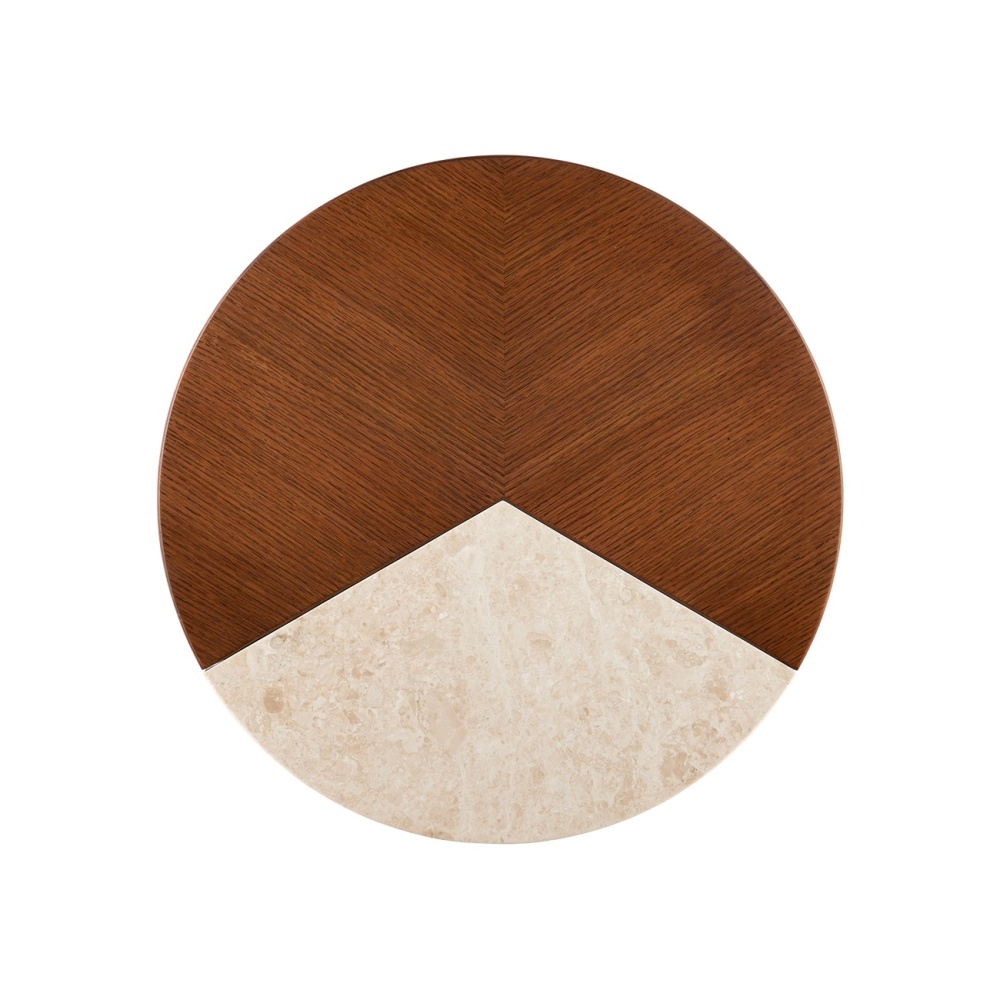 The Dakota Small Cocktail Table has reeded pedestal base made of solid oak with a brass plinth at the bottom. The oak veneer top has a slice of Crema Marfil marble wedged into it. Fine chamfers seam the two materials as a nice detail brought to this mid-century-modern inspired design.