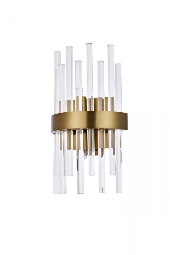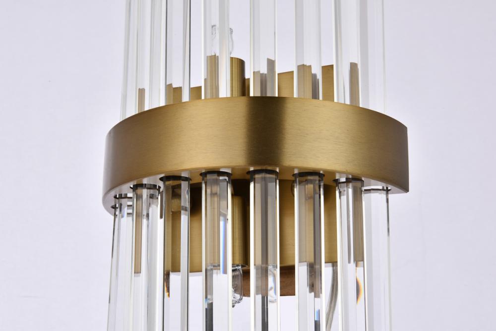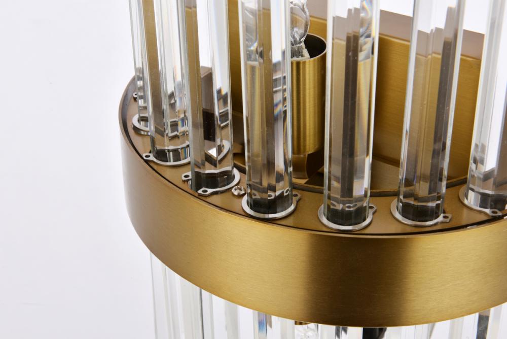 This stately fixture combines timeless elegance with modern and attractive sophistication. The delicate juxtaposition of upright and hanging clear glass rods creates a truly stunning visual statement, seamlessly woven together within a sleek gold frame. This expressive piece would be a welcomed and treasured addition to a wide range of contemporary residential styles.