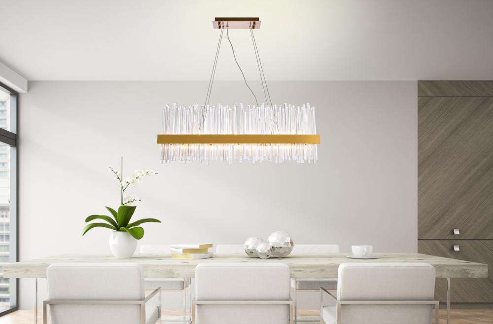 Fixture is 36 inches in length, 12 inches in width, and 14 inches tall, with adjustable hanging heights