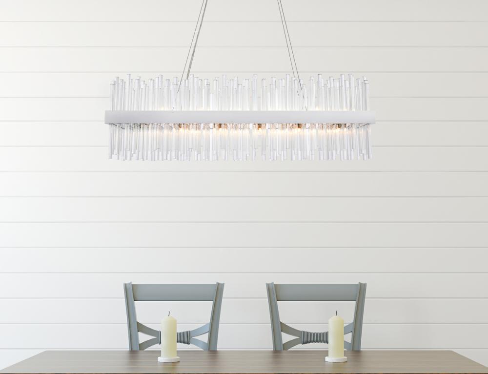 This stately fixture combines timeless elegance with modern and attractive sophistication. The delicate juxtaposition of upright and hanging clear glass rods creates a truly stunning visual statement, seamlessly woven together within a sleek bold metal frame. This expressive piece would be a welcomed and treasured addition to a wide range of modern residential styles.