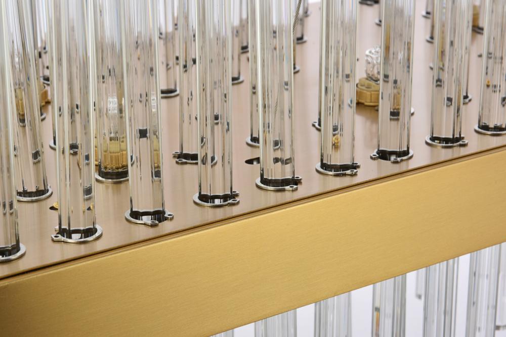 This stately fixture combines timeless elegance with modern and attractive sophistication. The delicate juxtaposition of upright and hanging clear glass rods creates a truly stunning visual statement, seamlessly woven together within a sleek bold metal frame. This expressive piece would be a welcomed and treasured addition to a wide range of modern residential styles.