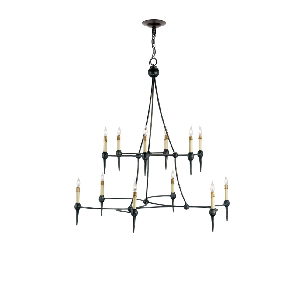 Like intersecting planets involved in their orbits, the U-shaped wrought iron arms of the two-tiered Danielli Chandelier gracefully converge as the overall design tapers to raise twelve points of light skyward. A French black finish serves as a sophisticated element of the design of this fixture, which measures 41 inches wide by 36 inches deep by 42 inches high.
