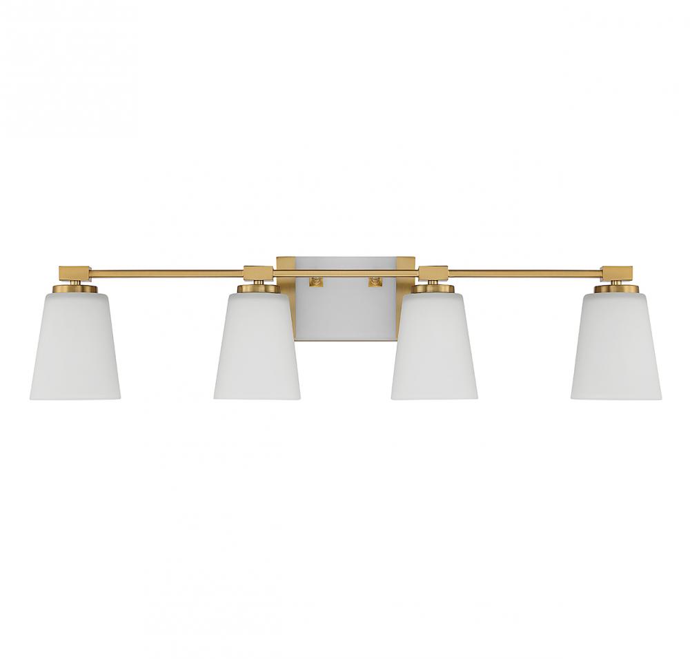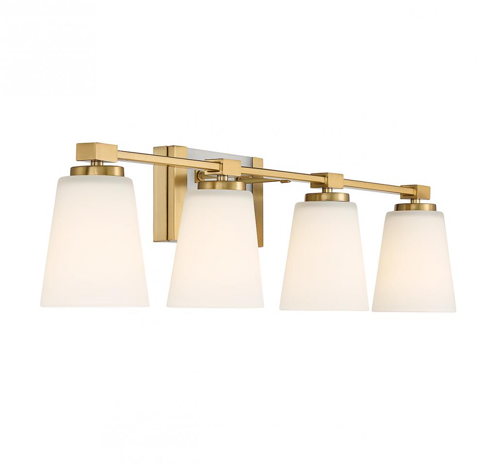 Add a relaxing spa feeling to any bathroom with the Savoy House Darby 4-light bath vanity light! White glass shades offer up a soft yet flattering glow while a matching pane of white glass creates a serene floating effect. Finished in warm brass. Darby is 8" in height, 34" in width and extends 7" from the wall. Uses four standard size bulbs of up to 60 watts per bulb (bulbs not included).