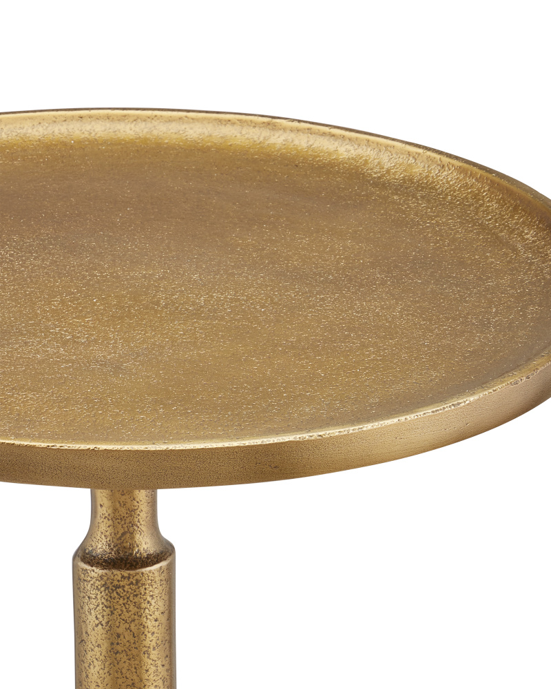 The Dasari Accent Table has a frame of aluminum that is hand-cast and finished to resemble genuine brass. The rich tones of the understated piece give it heft, making it an ideal complement to a variety of traditional or transitional interiors. The column connecting the mottled top and base reads like a baluster to provide this table added interest. Place it within industrial chic interiors, mid-century modern rooms or classically contemporary spaces to prove its versatility.