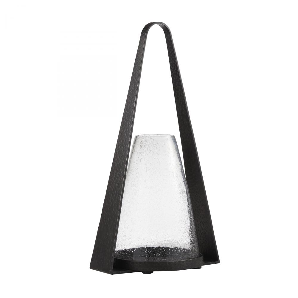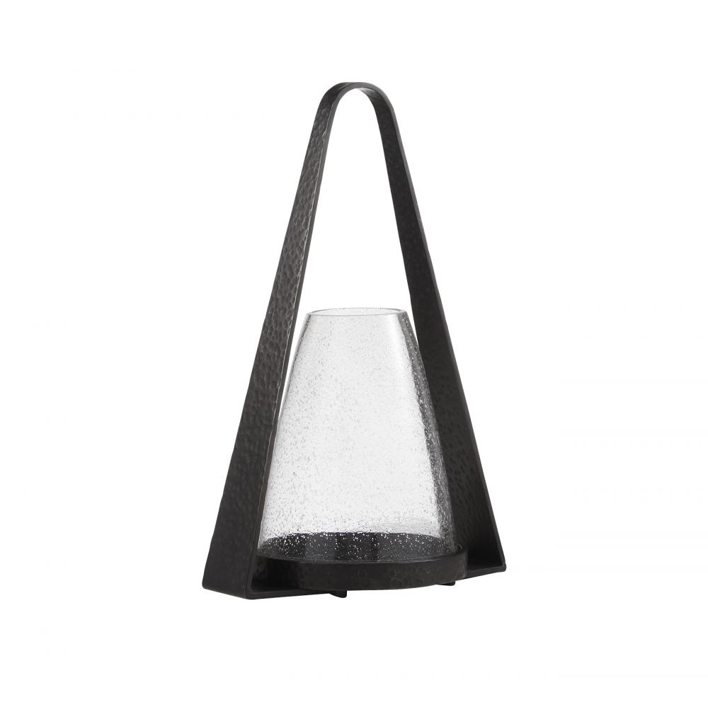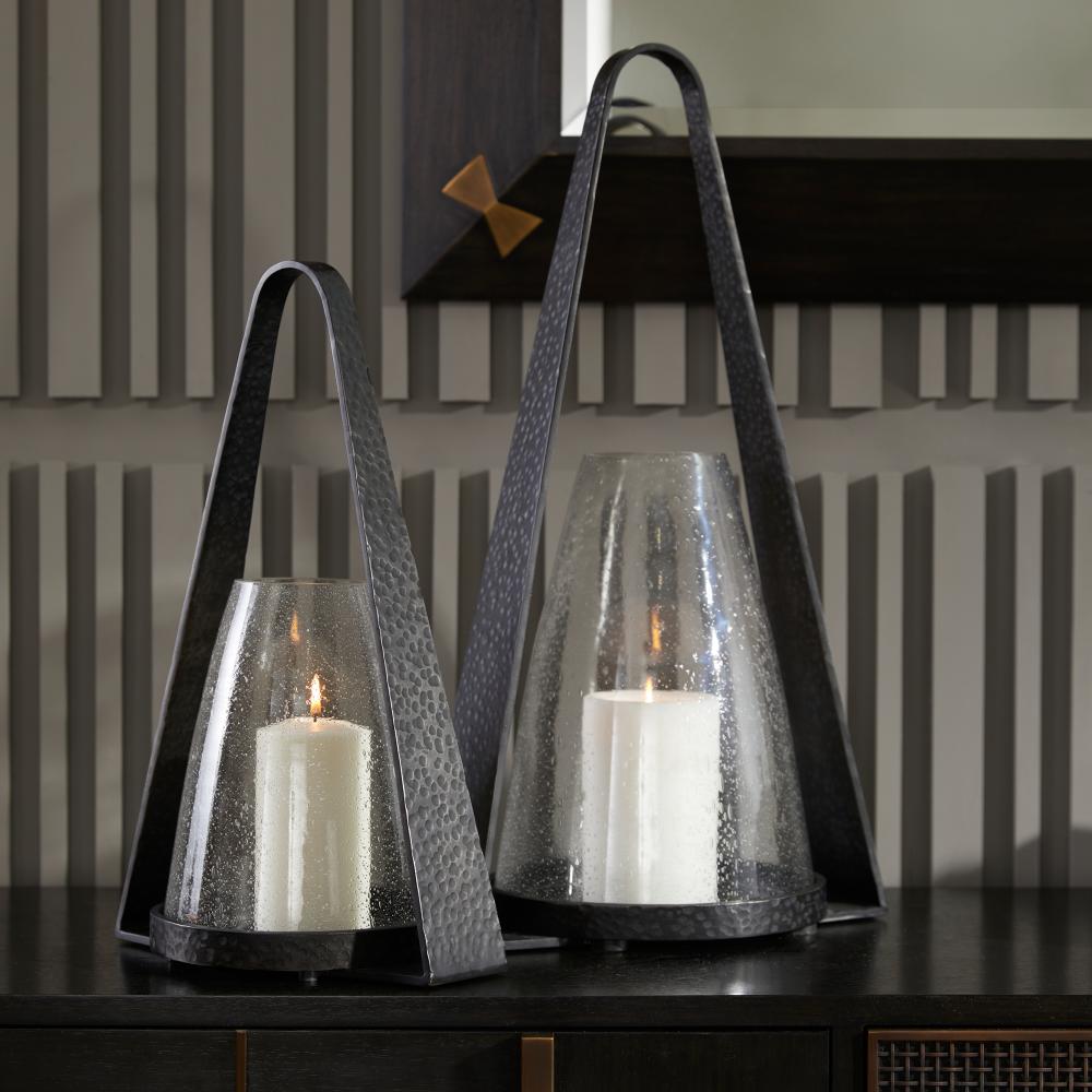 A pair of elegant hurricanes in clear seedy glass, Dayton offers a fresh twist on the traditional floor lantern. With a subtly tapered shape inspired by an equestrian stirrup, the sturdy base and handle of hammered blackened iron feature a top hoop for easy portability. Finish will vary.