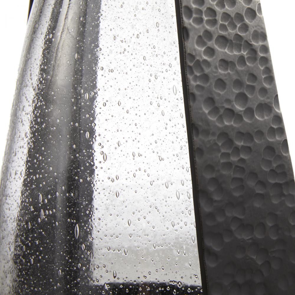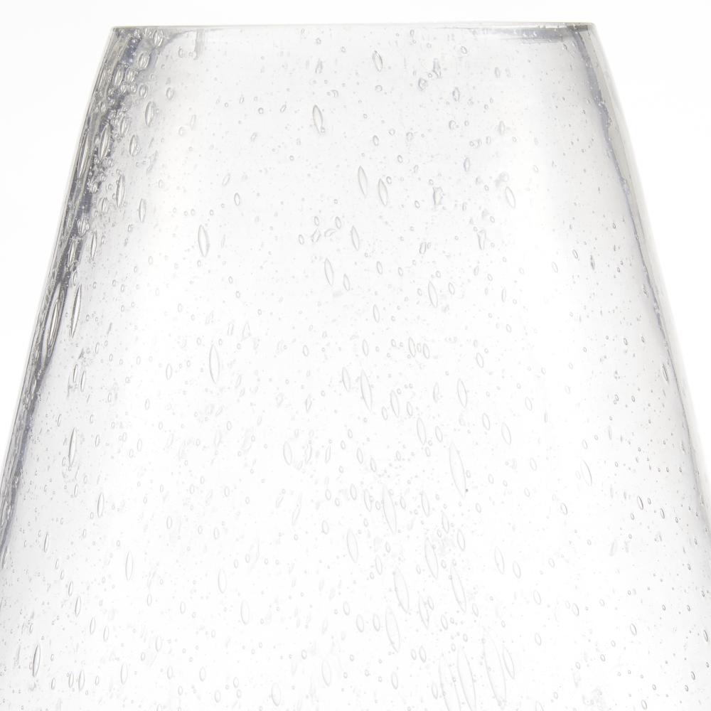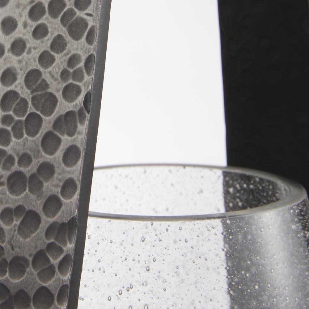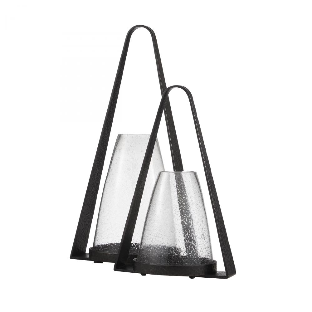 A pair of elegant hurricanes in clear seedy glass, Dayton offers a fresh twist on the traditional floor lantern. With a subtly tapered shape inspired by an equestrian stirrup, the sturdy base and handle of hammered blackened iron feature a top hoop for easy portability. Finish will vary.