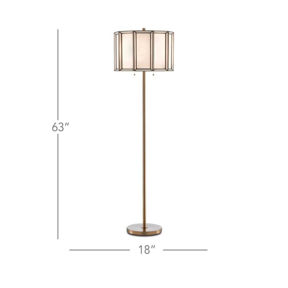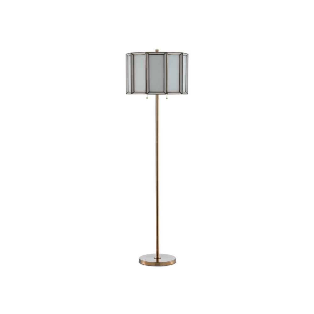 When a soft glow is desired, milk glass is one of the best materials to diffuse illumination. Our Daze Floor Lamp is made of articulated panels of white milk glass that are joined together by ribs of metal in an antique brass finish. This milk-glass floor lamp will turn luminous when it is switched on.