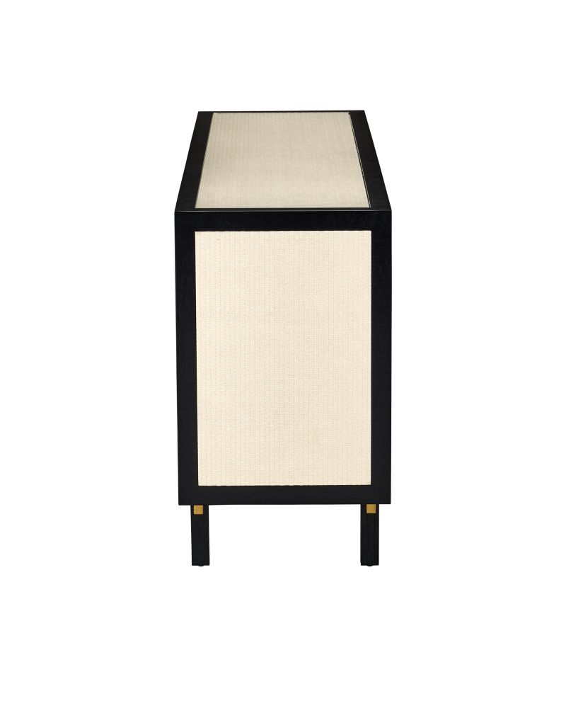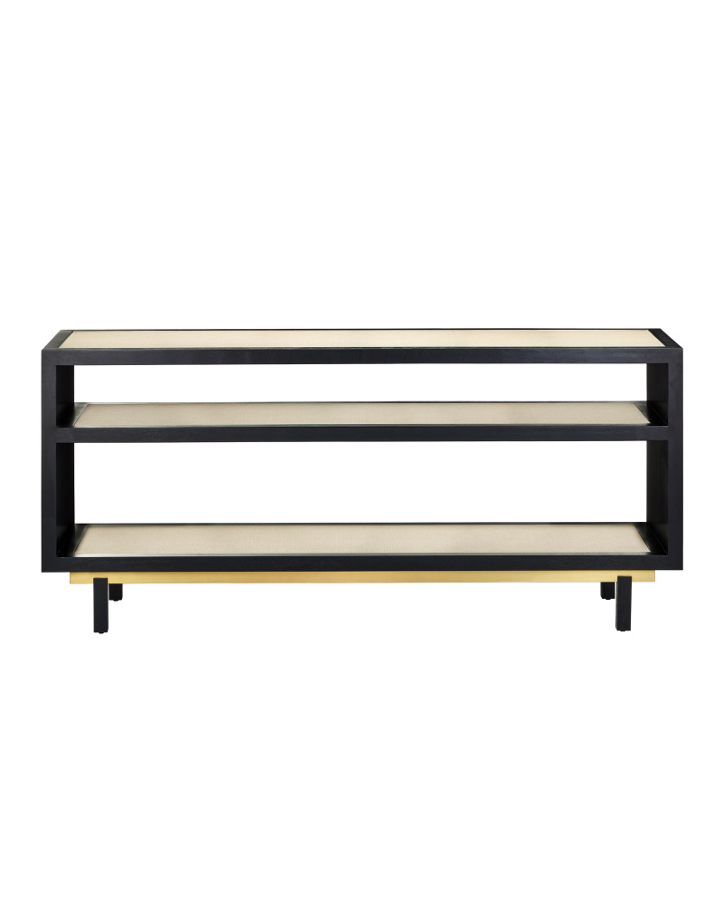 The Deanna Console Table has panels of woven raffia on its top, sides and shelves that are surrounded by black strips of Okoume woodto coordinate with the table’s legs. The combination of black and ivory brings this piece a tailored feel that fits within a wide spectrum of design styles, especially a room that exudes Hollywood glamour. The subtle texture of the raffia is a special aspect of this design, as is the fact the table and shelves are fitted with inset glass to protect the natural fibers. A plinth base is made of metal in a brushed brass finish, the clean lines bringing added sophistication to the piece.