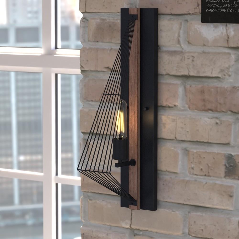 Strong geometric overtones clearly suggest a modern industrial flair in the Dearborn collection. Black Iron finished wire along with accents of burnished oak and vintage Edison bulbs are a stunning combination.