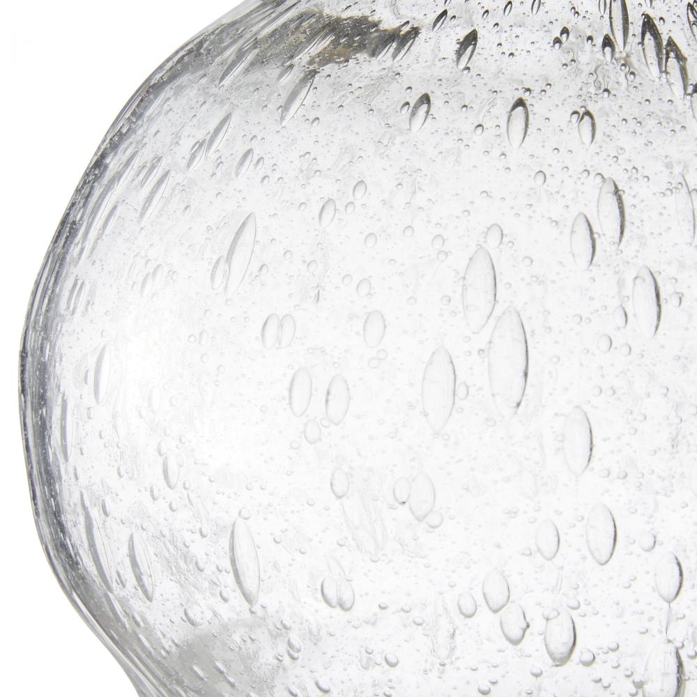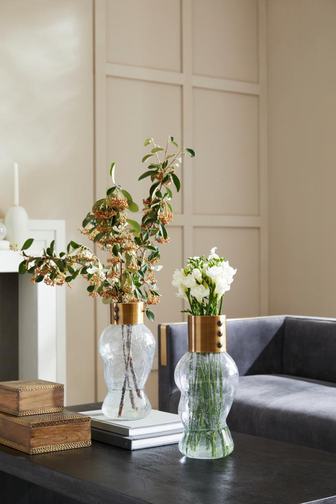 Fashion was the inspiration for a pair of clear, seedy glass vases. The volume of a puff sleeve adds whimsy to each rounded form, while a "cuff" of vintage brass accents each tailored top.