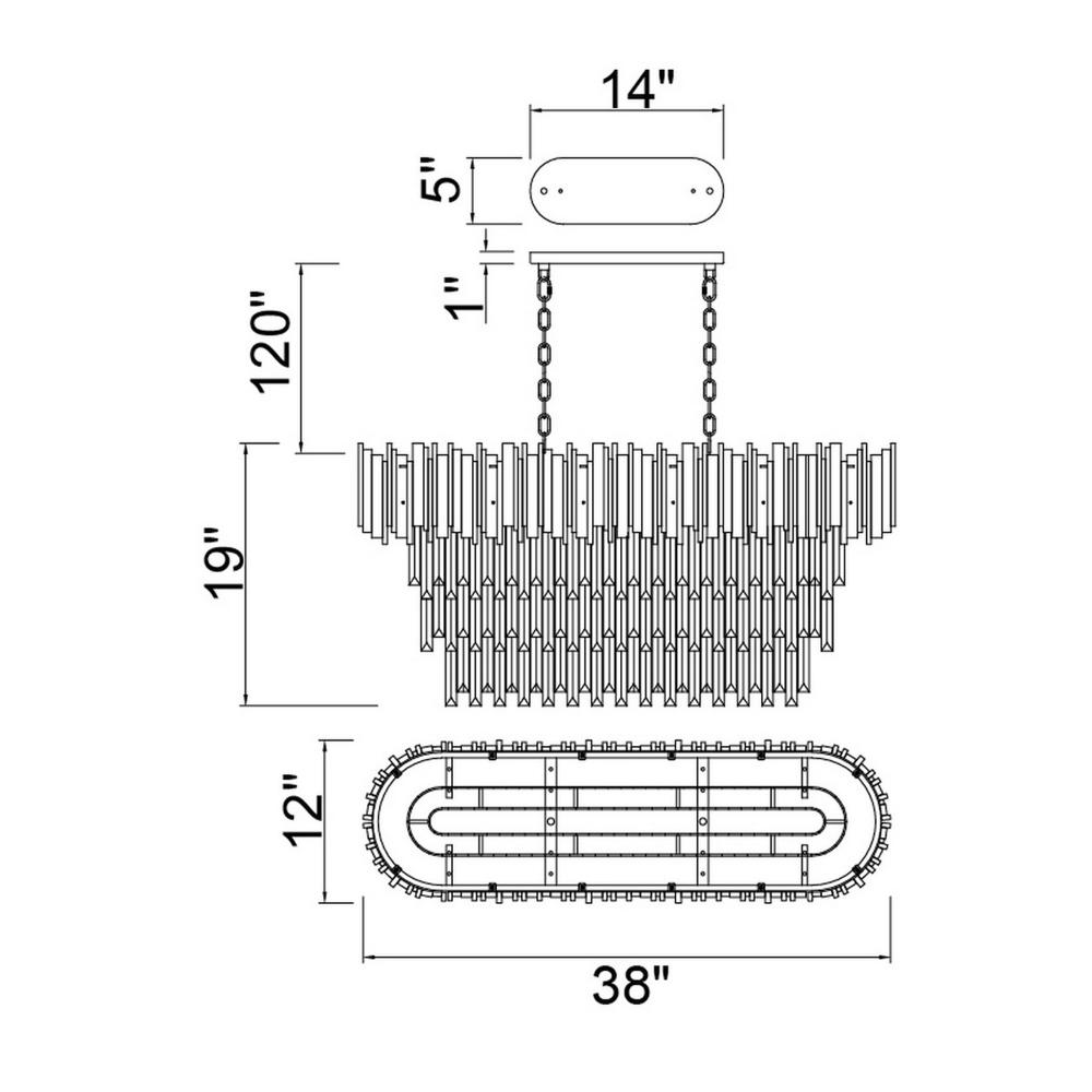 Transform your dining area, kitchen island, or game room into a glamorous gathering space with the Deco 9 Light Pool Table Light in Medallion Gold Finish. Measuring 38 inches long, this modern chandelier showcases an architectural racetrack frame adorned with overlapping narrow gold bars. Two tiers of clear crystal prisms cascade from the frame, creating dazzling reflections from nine candelabra-based bulbs (LED-compatible). Sleek yet opulent, this striking fixture elevates your space with sophisticated sparkle and an unmistakable sense of style.
