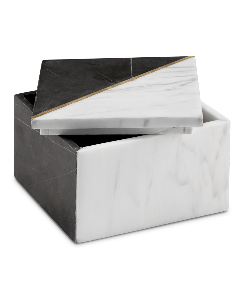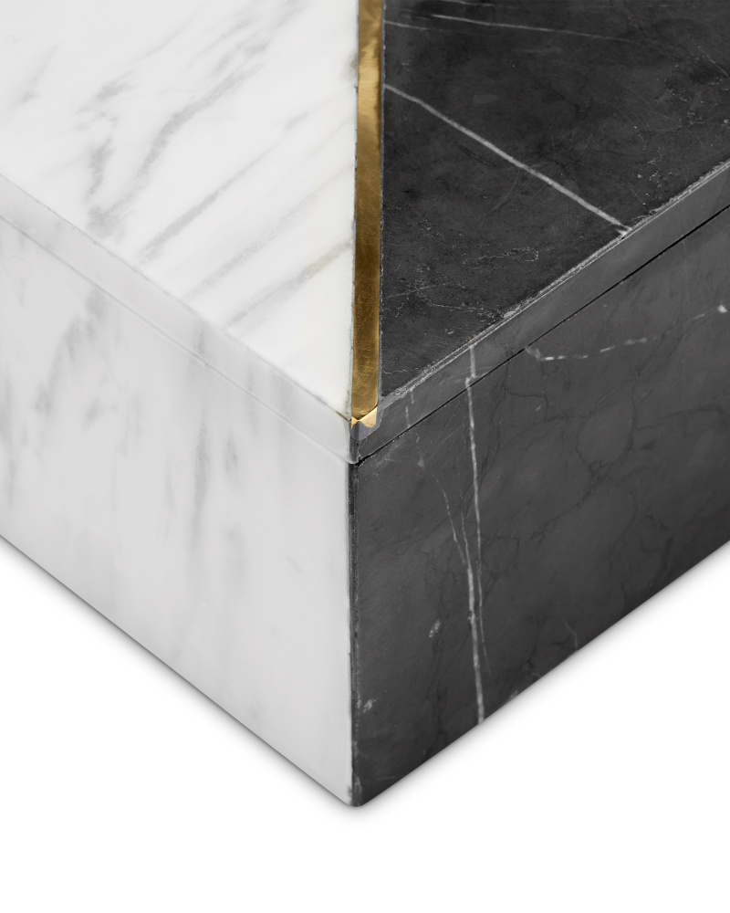 The Deena Black & White Marble Box is geometrically sophisticated. The white and pietra gray marble are juxtaposed against each other in a dynamic way: the two dark sides are topped with a triangle in the same color, and it is the same with the white. Slicing through the middle of the top to separate the two is a brass inlay on slant. The solid marble black and white decorative box has mitered joints and a composite coating on the bottom to keep it from scratching surfaces.