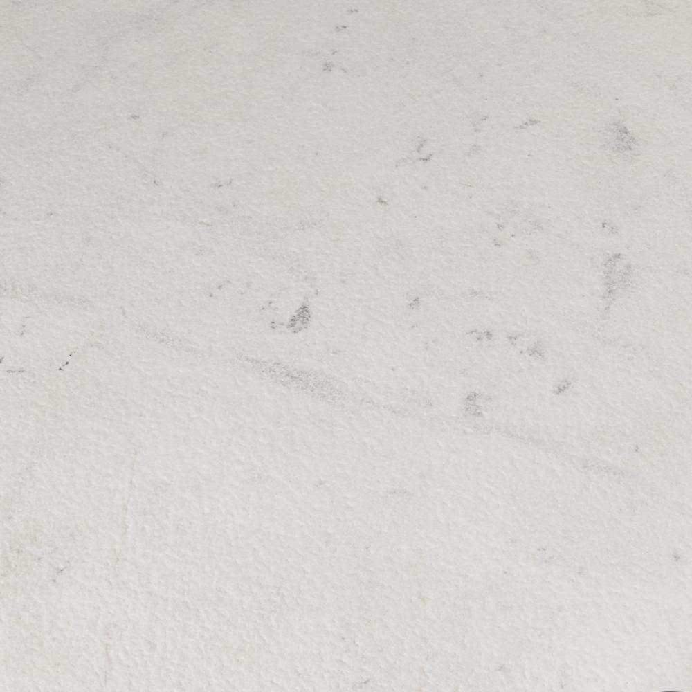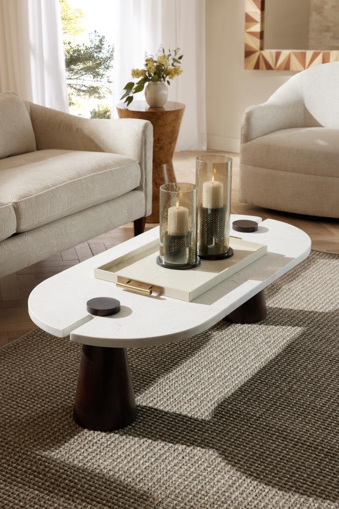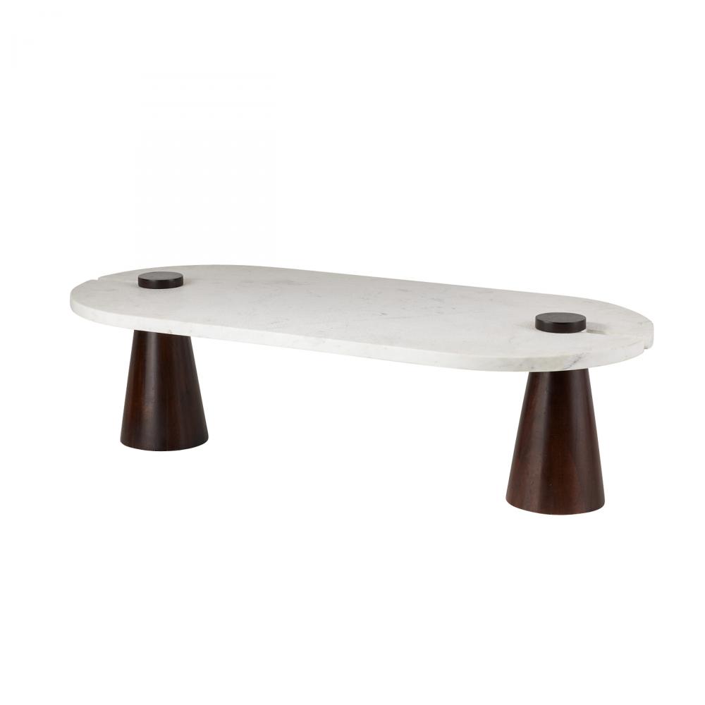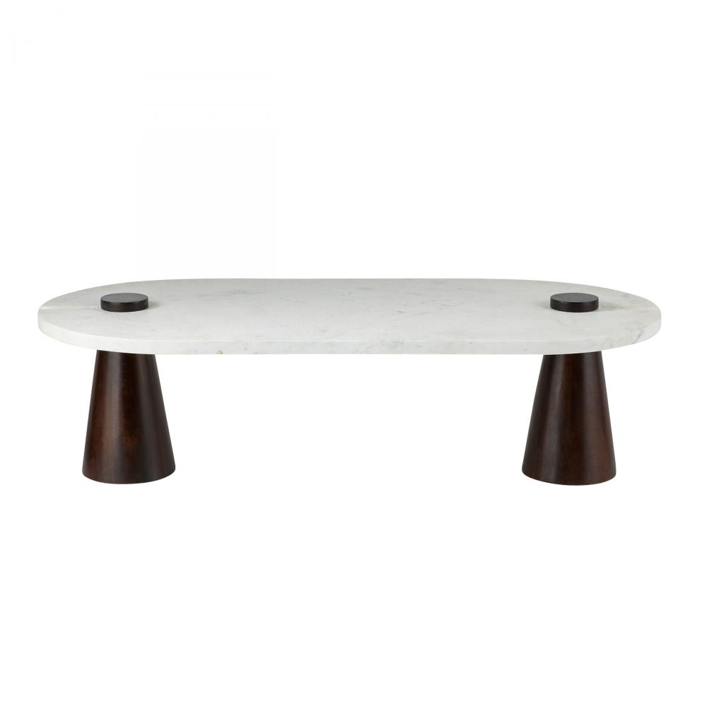Joinery gives the illusion of piercing an oval of honed white marble. With a split reveal at either end, the top balances on pedestal legs of umber mango wood. Finish will vary.