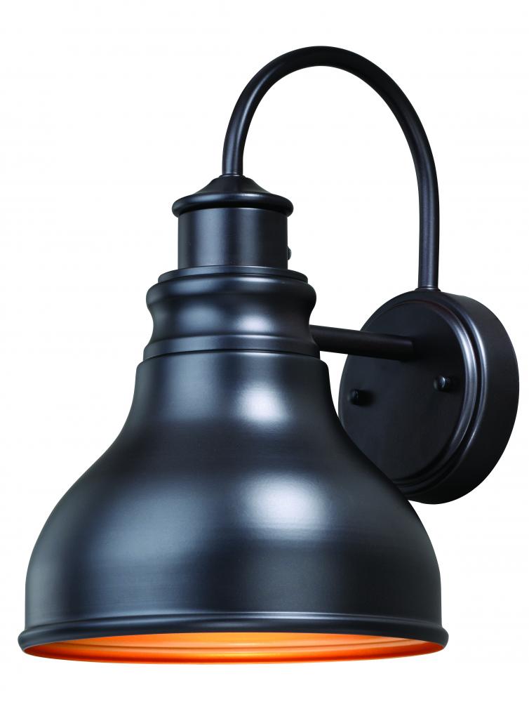 A modern barn light the Delano takes a popular style and adds an updated twist. The Delano is dark-sky compliant and features a gold inner finish, to add extra warmth to the look and feel of this light. Mount these lights on your porch, entryway, or garage and experience this stylish look for yourself. It is sure to be a great addition to your home’s exterior décor. It has a built-in dusk to dawn photocell that automatically turns the light on at dusk and turns it off at dawn, saving energy during daylight hours.