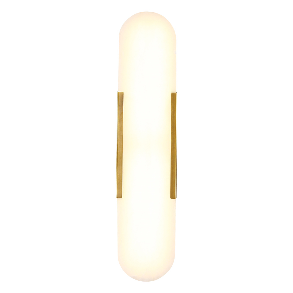 A sleek vertical sconce crafted from natural alabaster, softly illuminated by integrated LED light. Framed with refined metal accents in brushed brass or matte black, it brings a warm glow and modern elegance to hallways, bathrooms, or bedside spaces.