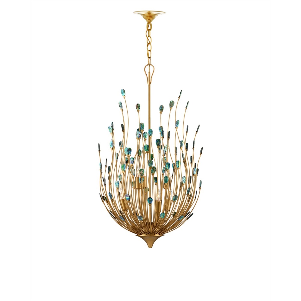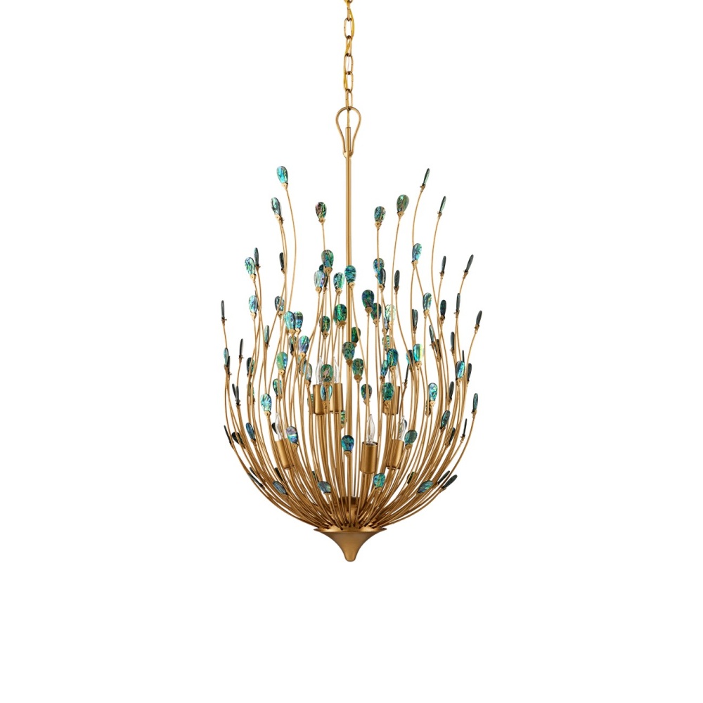 The teardrop-shaped Delphos Chandelier is inspired by birds and feathers; the fixture flows gracefully and evokes the elegance of a peacock’s tail. Beautifully crafted from wrought iron in a contemporary gold finish, the nature-inspired piece is ornamented with double-sided, highly polished New Zealand Paua Shells. This is a painstaking piece to realize, as the rods are bent by hand into the undulant composition and the luminous shells are hand-placed. The turquoise and gold chandelier will bring lively color to an interior thanks to the variations in the iridescent hues within each of the ornamenting shells. Adjustable from 37" to 105" with use of included chain/rod kit/cable. If your space calls for a longer drop, additional chain/rods/cable is available for purchase.