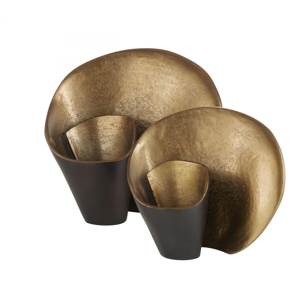 Playful spirals of antique brass intrigue the eye. These striking sculptures have an abstract appeal, enhanced by bronze finishing along the outside of their curvaceous silhouettes. Finish will vary.