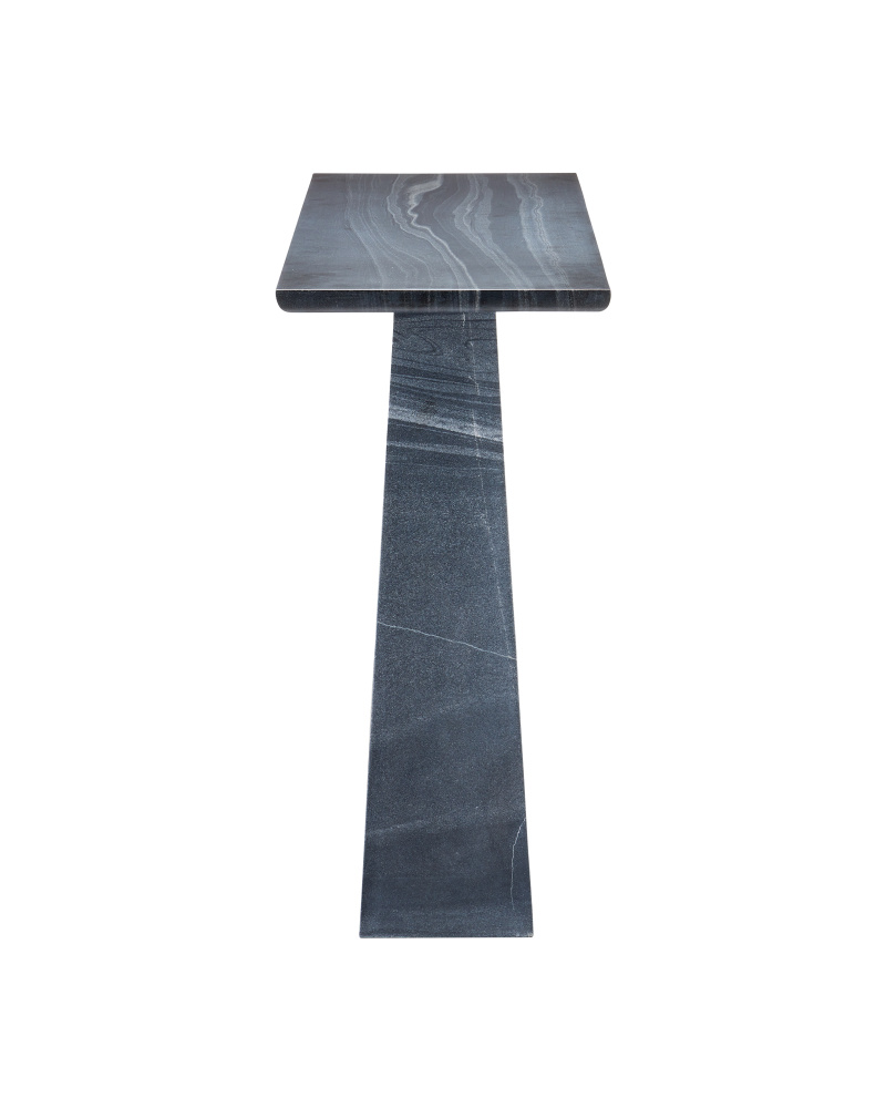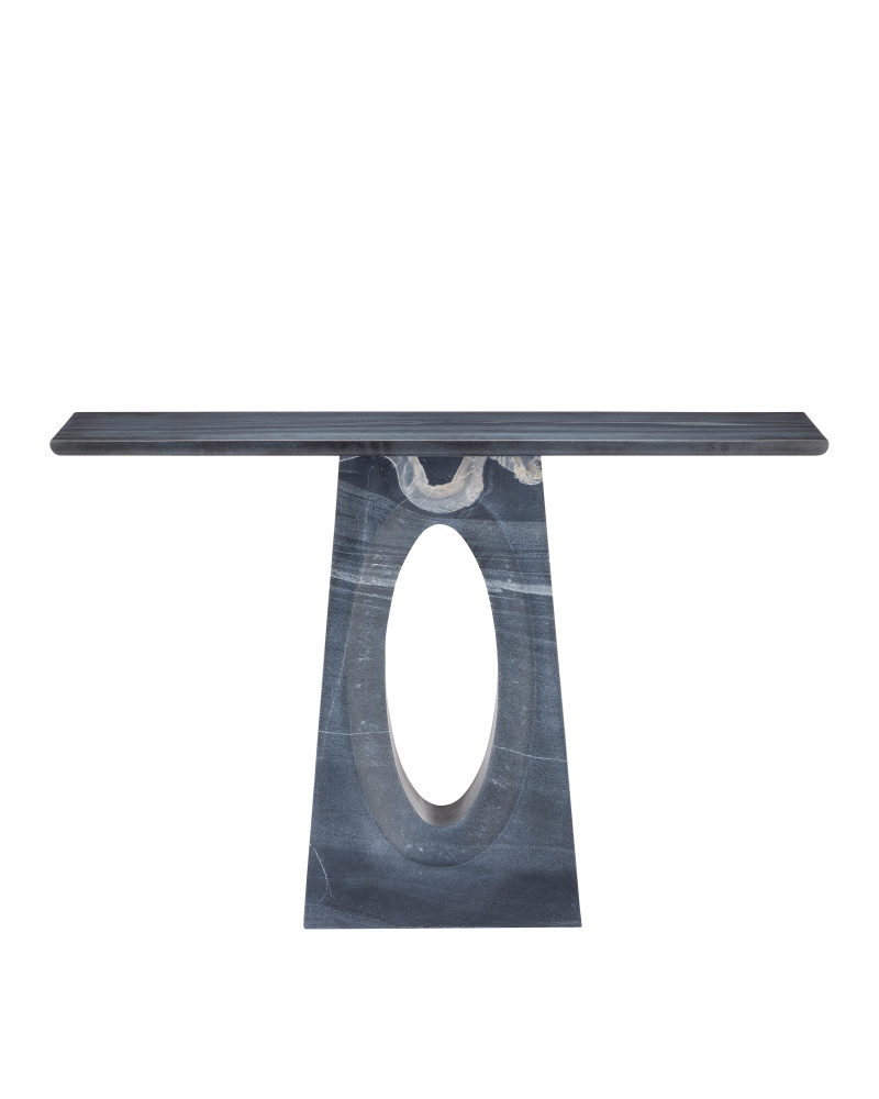 The Demi Black Console Table is made of solid Bheslana marble. A bevel softens the oval that is carved into the stone on both sides to infuse the black accent table with sophistication, as the cut-outs form an oculus. The way the base tapers to a smaller form toward the top is a shapely design move, as is the chamfered detail under the top. This table has a dynamic personality thanks to the veining in the marble, which means each one will be unique.