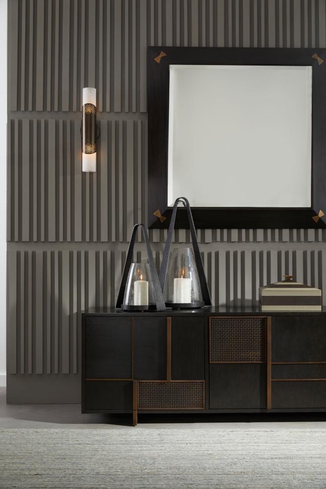 Inspired by the compositions of Piet Mondrian, the delicate linework of this media cabinet makes it a functional work of art. A patchwork pattern of brindle eucalyptus and ebony walnut veneer is enhanced with lines and grids of antique brass iron design. The interior is fitted with adjustable shelving in ebony oak veneer. Finish will vary.