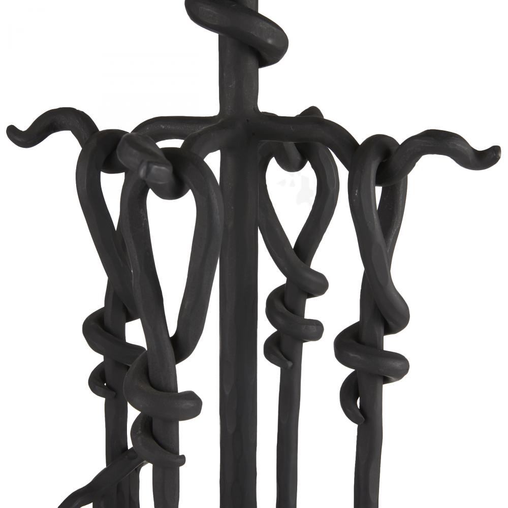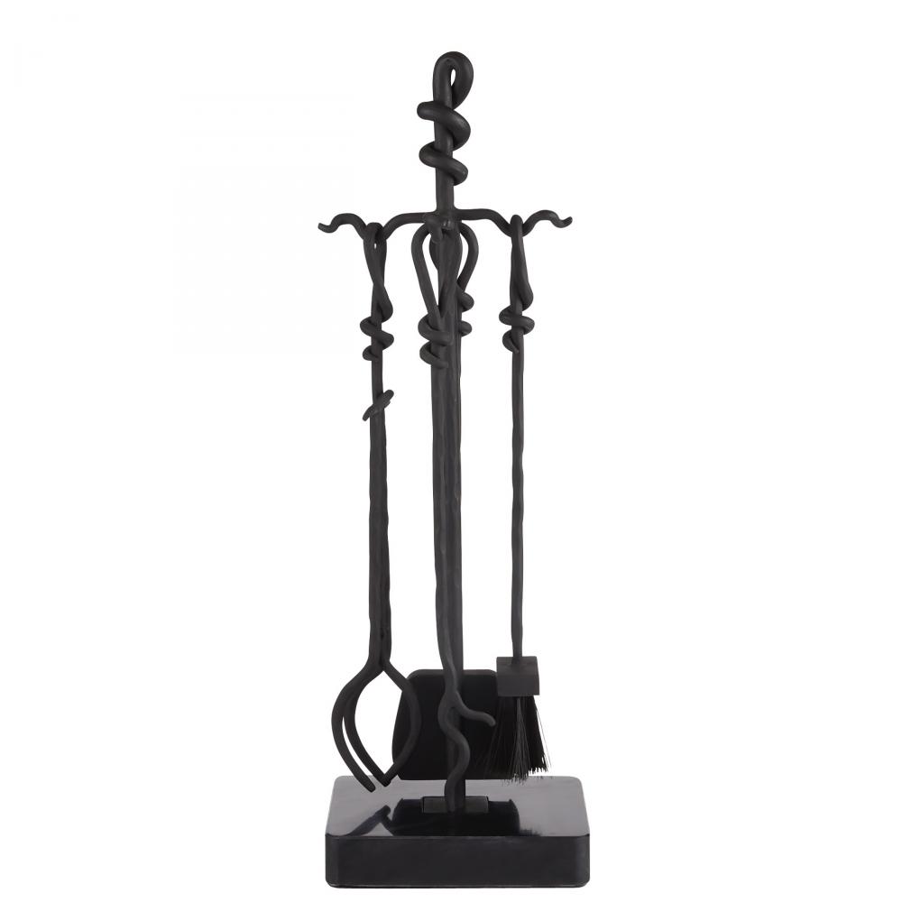 Inspired by medieval ironwork, a blackened, hammered iron toolset offers a playful and literal twist on a timeless hearth essential. The angular handles of the poker, shovel, and tongs entwine together in a form reminiscent of the twisted roots of a tree. A matching iron base complements the set. Designed to pair with the Denison Log Holder. Finish will vary.