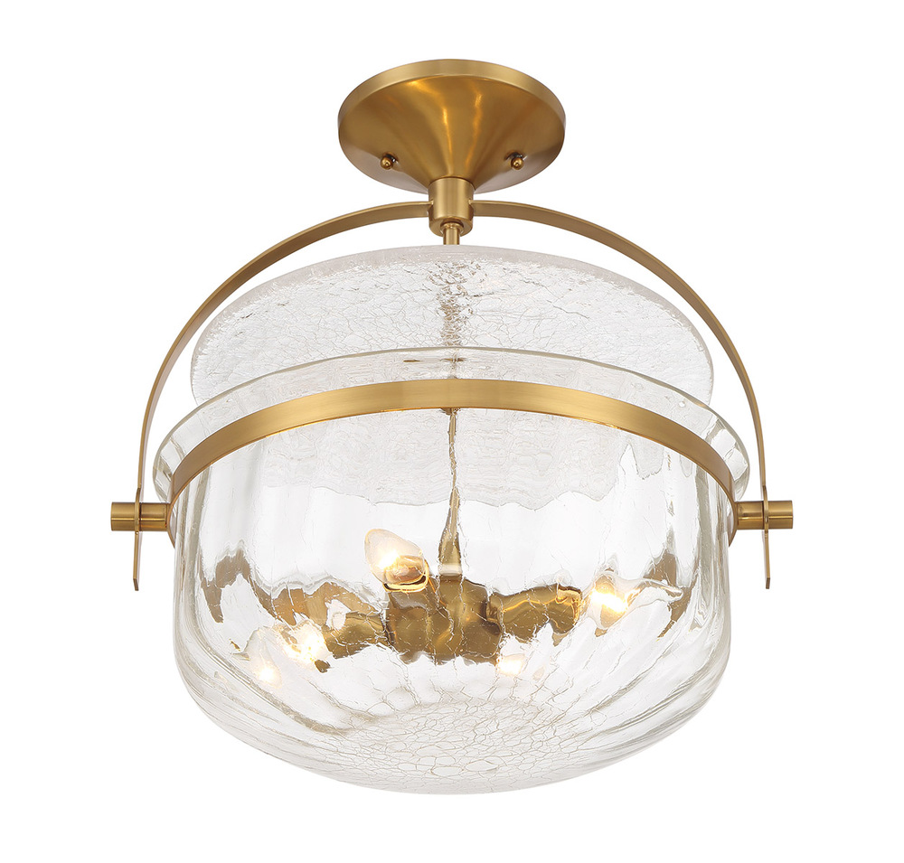 The Savoy House Denmar 4-light convertible semi-flush mount perfectly illuminates a wide variety of spaces with its classic style. It also has superior versatility because it can be used as a hanging pendant or ceiling light! The shade and diffuser of crackled glass bring eye-catching texture while the Warm Brass finish adds richness. Denmar is 18" in width and has an adjustable height ranging from 19" to 73". Comes with four 12" downrods and one 6" downrod. Uses four candelabra size bulbs of up to 60 watts per bulb. Bulbs not included.