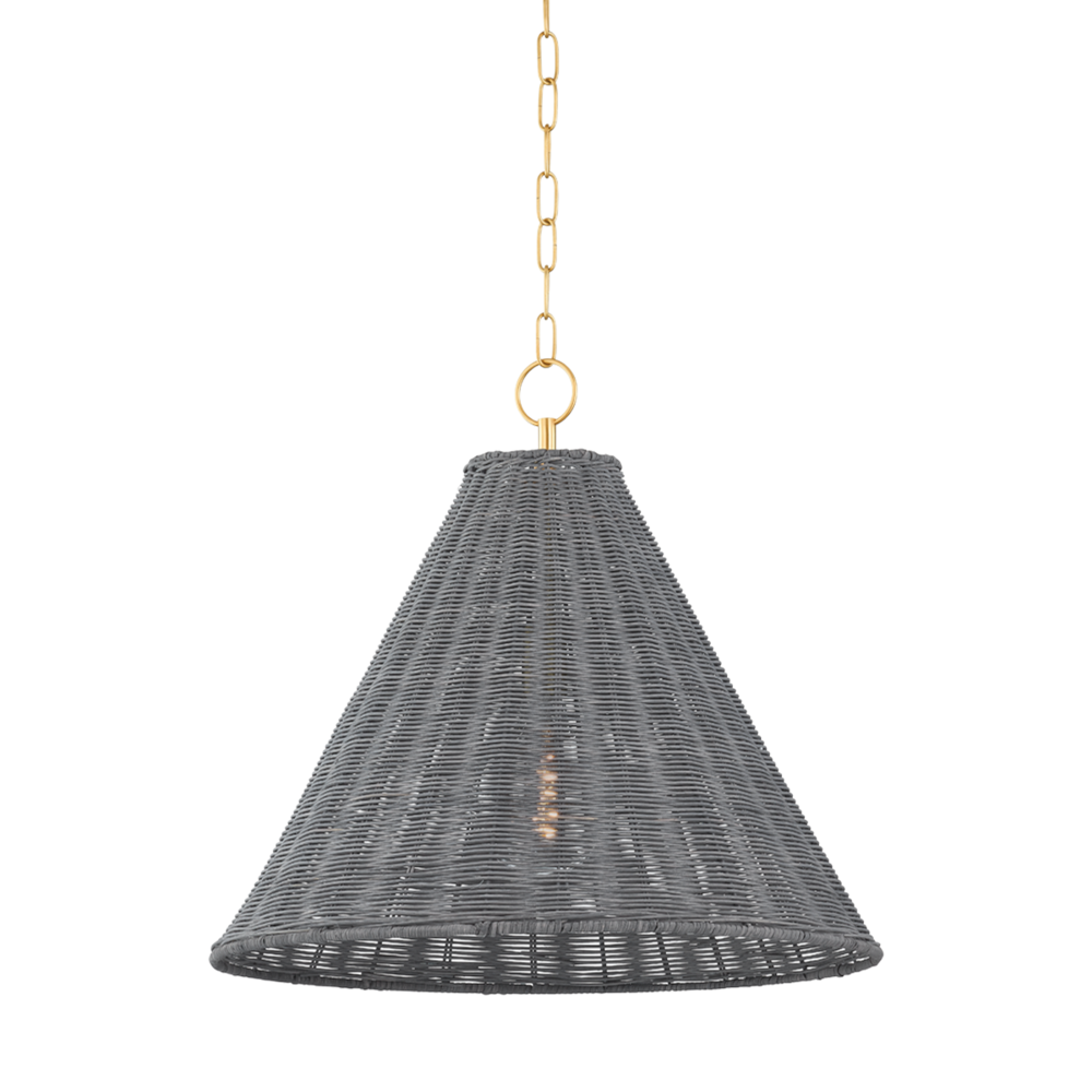 Combining the beauty of natural wicker and polished Aged Brass, this coastal-inspired fixture exudes understated elegance. When illuminated, the golden-hued brass gleams through the gray wicker, creating a warm and earthy glow. Available as a sconce, pendant, or floor lamp. Part of THELIFESTYLEDCO® collection.