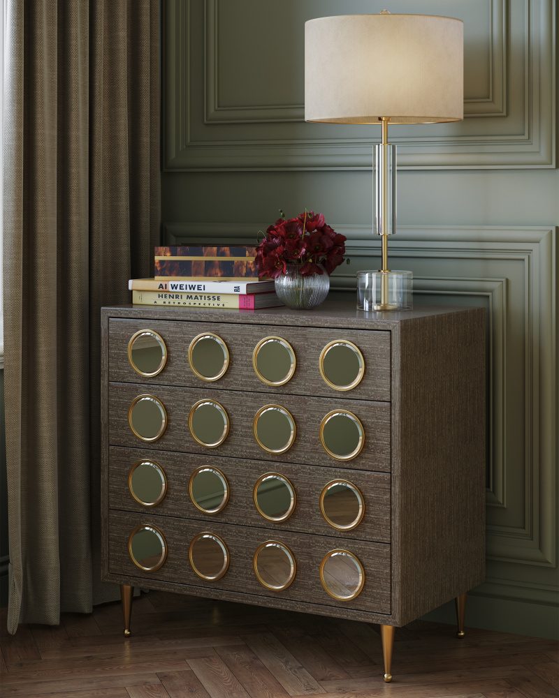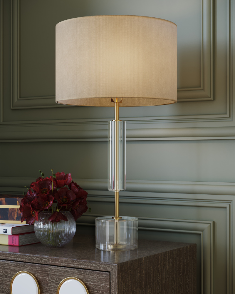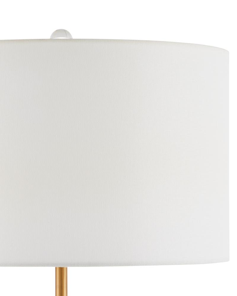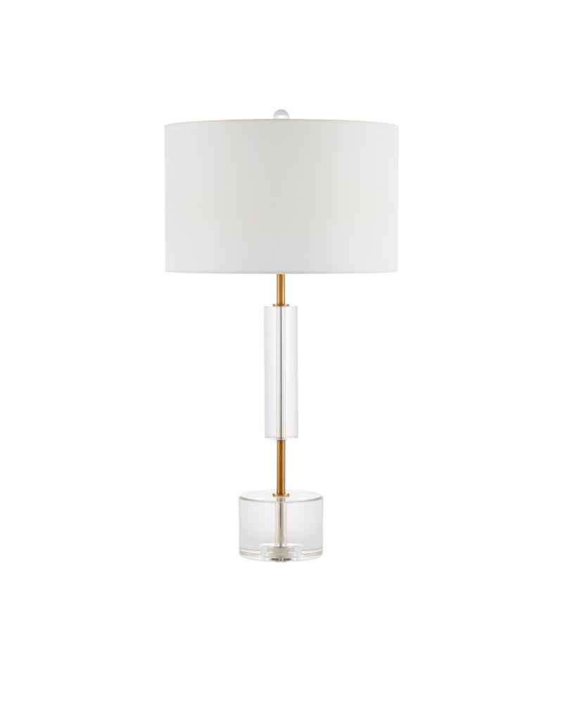 A study in contrasts, the Deville Table Lamp has a thin metal stem in an antique brass finish that rises from a thick disc of optic crystal through a slimmer cylinder before it disappears under the crisp white shade. The clarity of the optic crystal makes this lamp luminous even when the lights are switched off.
