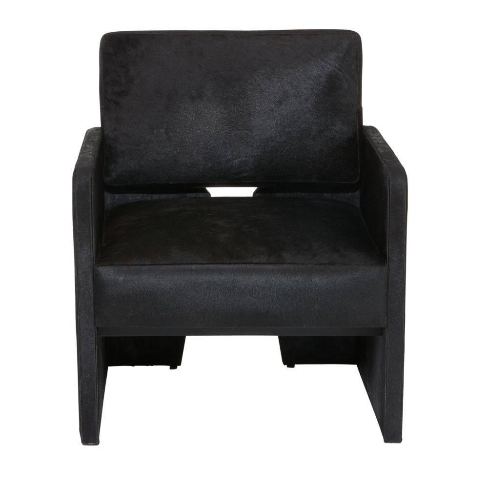 Bringing back the best of 1990s-influenced style, this handsome black hair-on-hide style was designed to please from every angle in a room. As attractive from the back as when seen head on, its precise lines are enhanced with a cinched hourglass back. Squared arms and a well-padded seat complete the silhouette. Hide will vary.