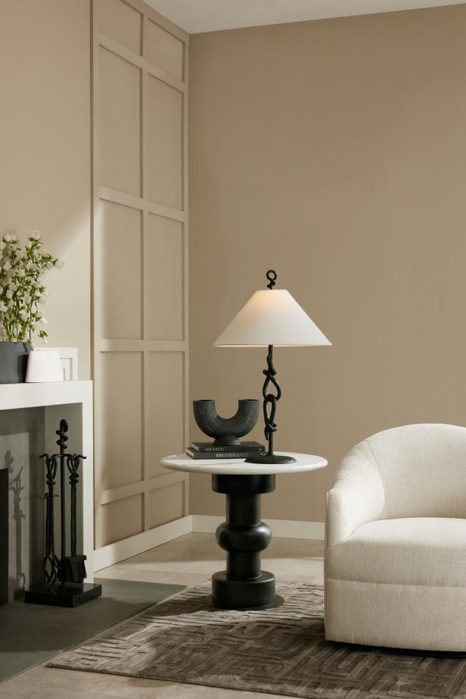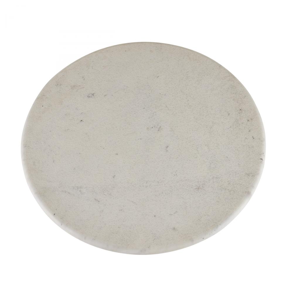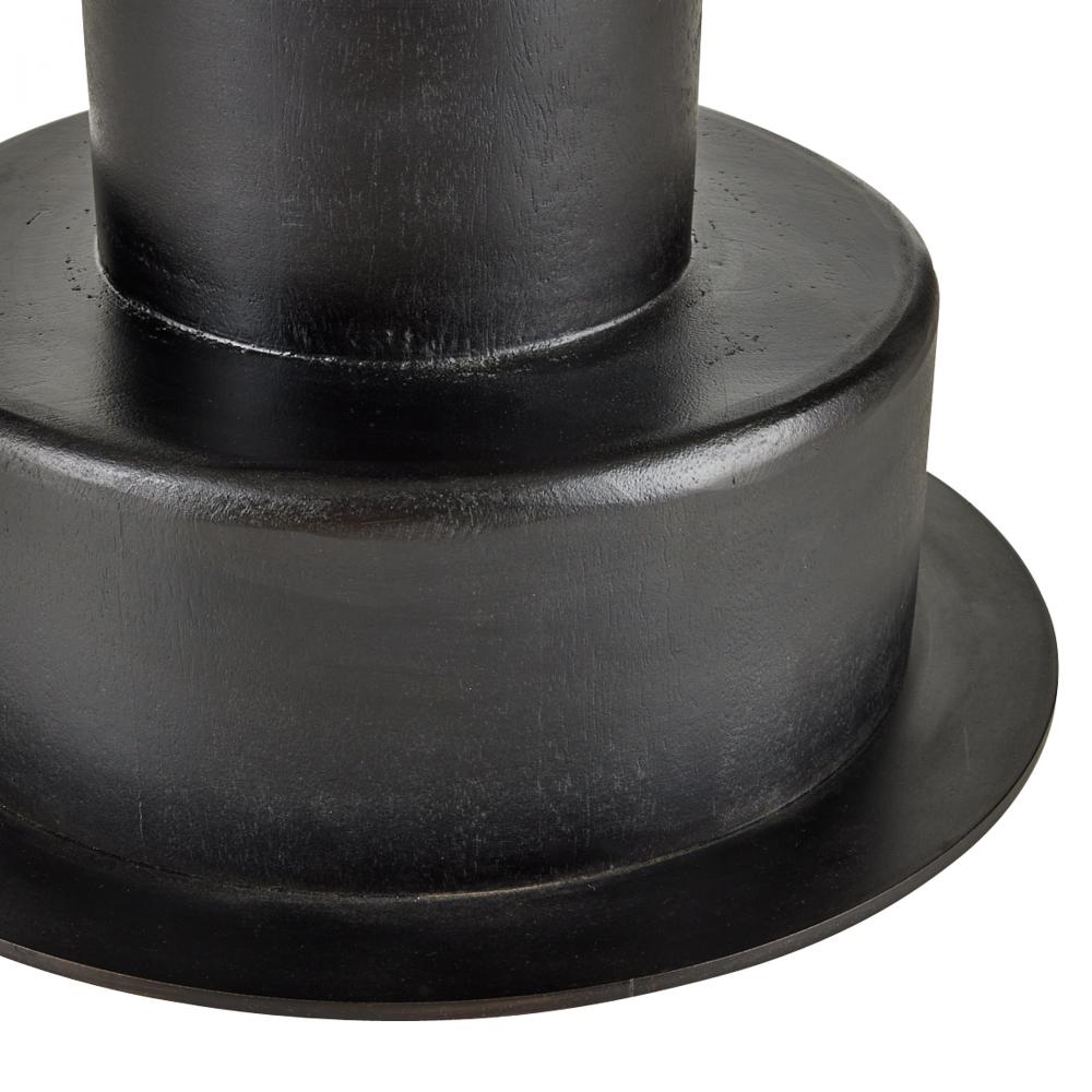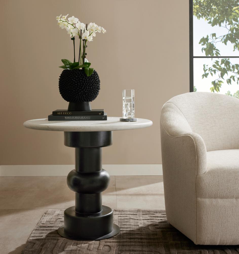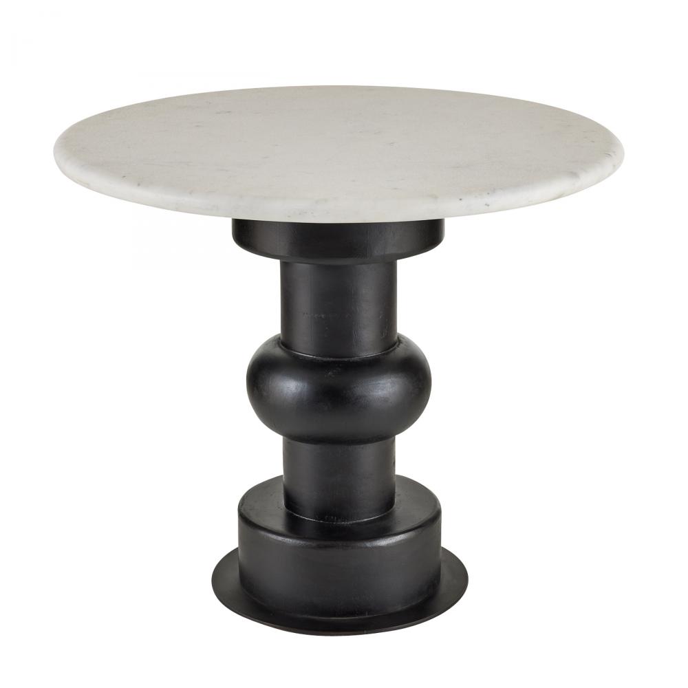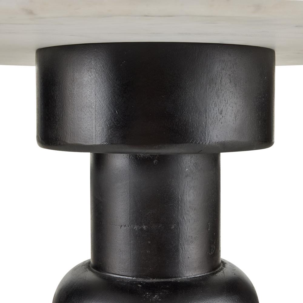 Adding a playful twist to a traditional William and Mary turned leg, this updated end table pairs an ebony oak wood pedestal with a circular top of white sandblasted marble. A bronze-plated iron base anchors the exaggerated proportions. Marble will vary.