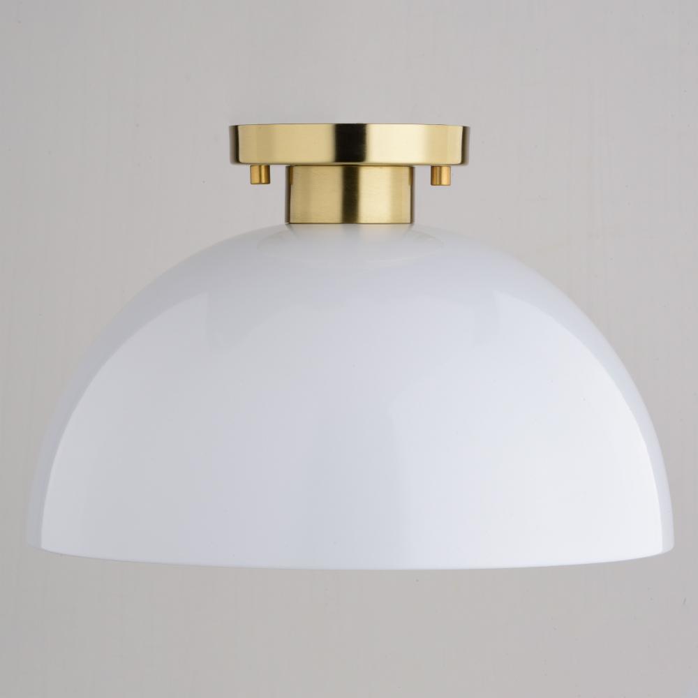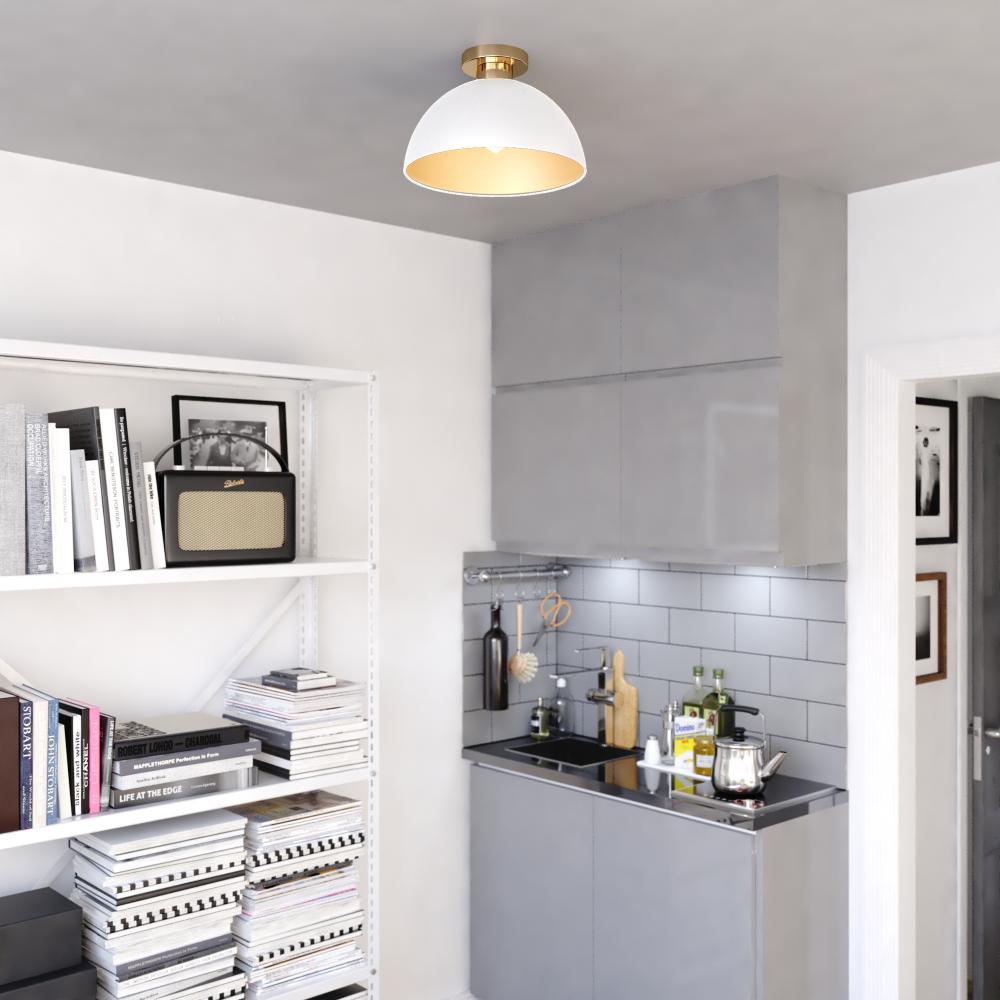 The Devon collection showcases a ceiling light that exudes elegance and simplicity at a great price point. The classic glossy white dome shape is complemented beautifully by gold satin brass accents which adds a luxe touch to the overall design. The golden interior casts a soft glow of focused light and shows off the light's blend of modern minimalism and classic elegance. This ceiling light works well with many mid-century modern and contemporary decors whether it’s your kitchen, breakfast nook, home office or entryway.