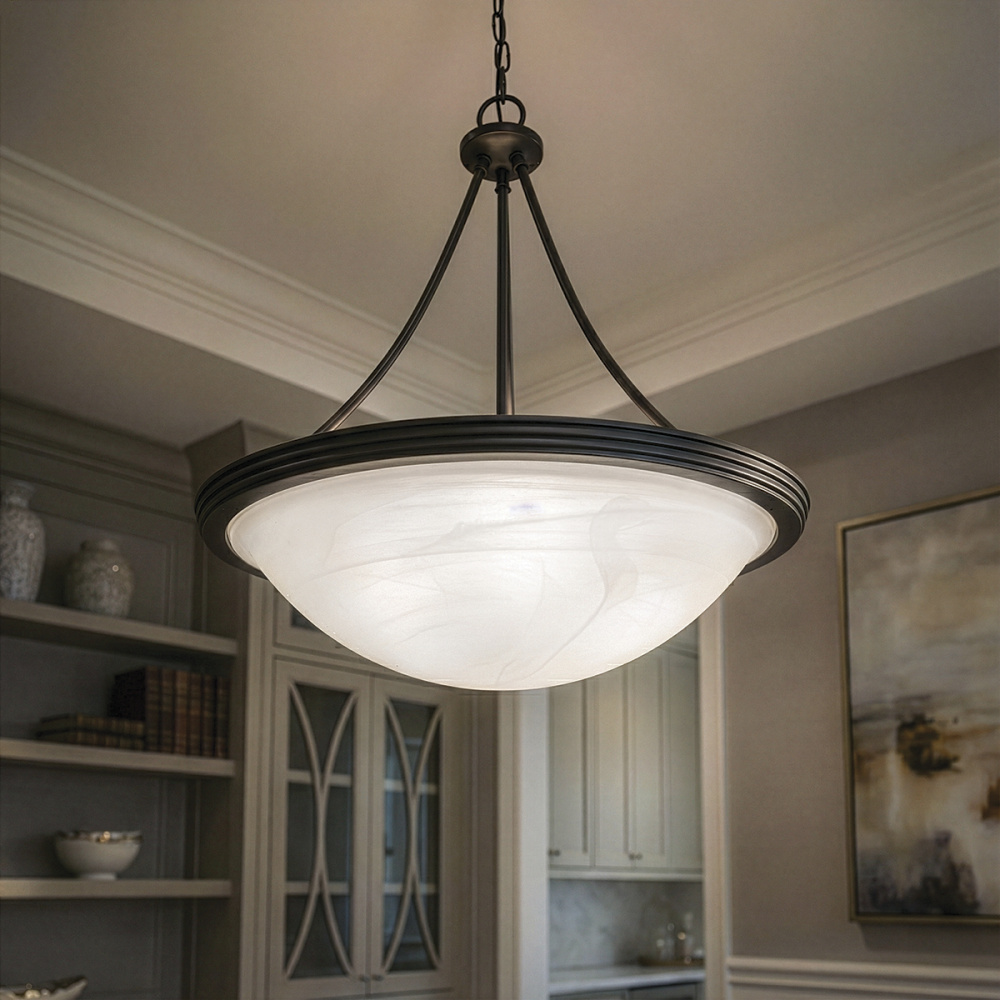 The alabaster shades diffuse illumination, creating a welcoming atmosphere without harsh glare.