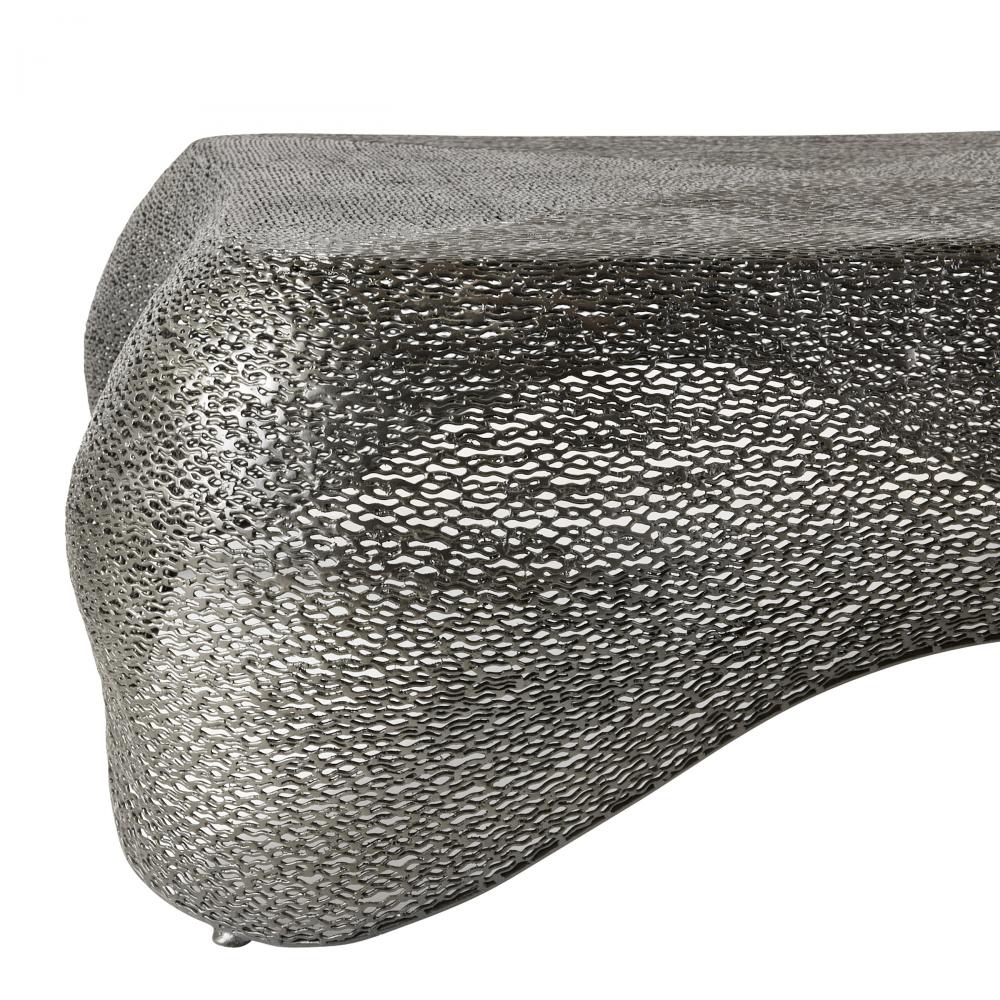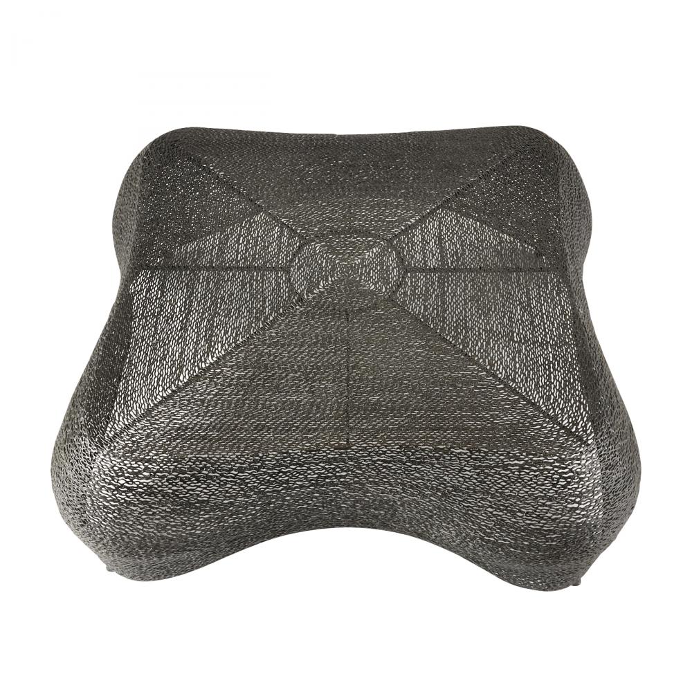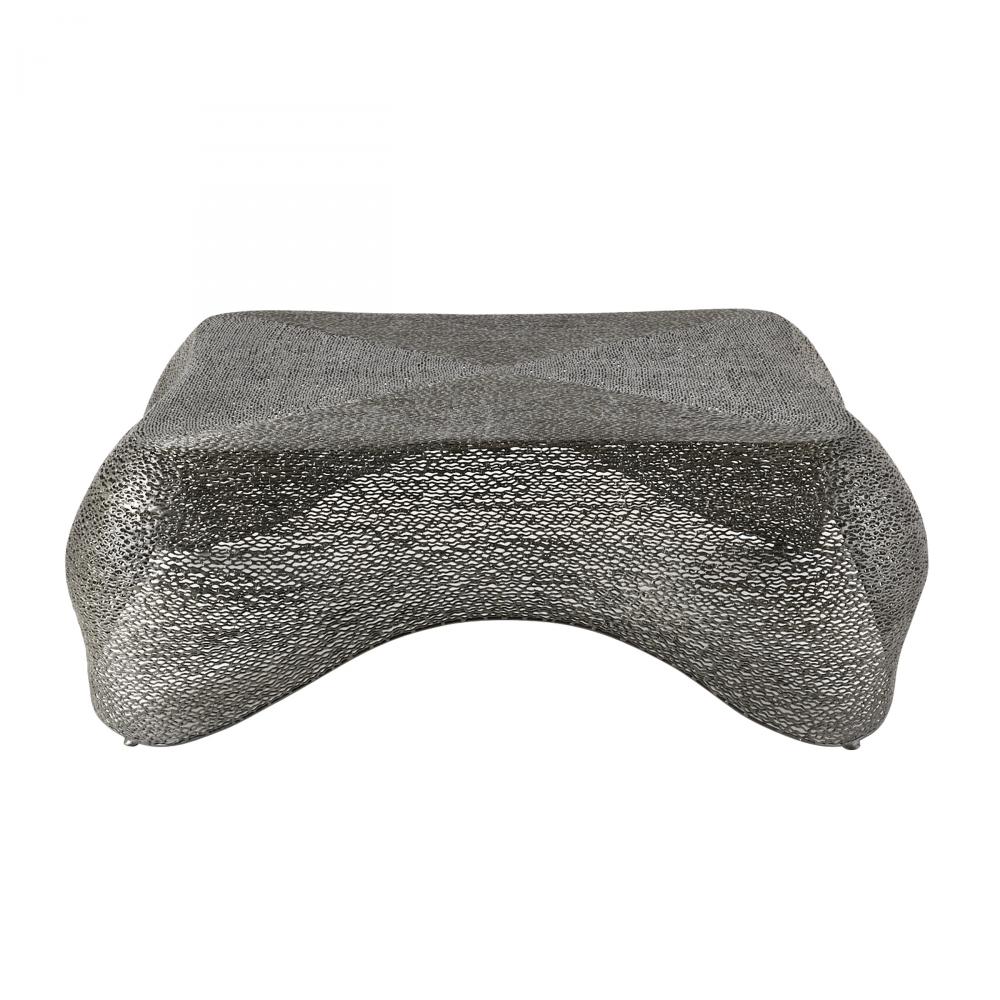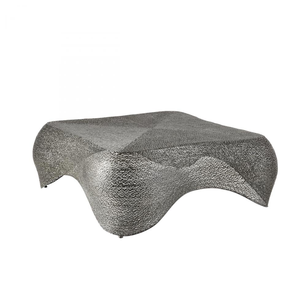 Formed of galvanized iron in a graphite shade, this table plays with transparency in an intriguing fashion. Designed to undulate around the entire structure, its webbed texture recalls the curves of a transparent jellyfish.