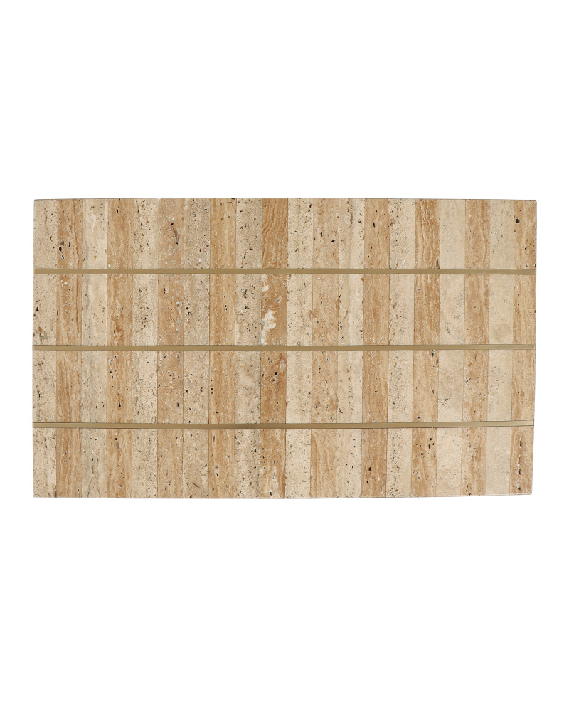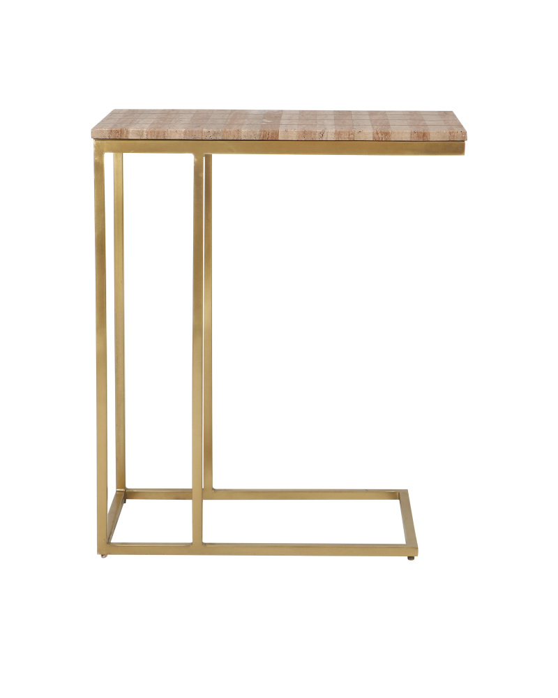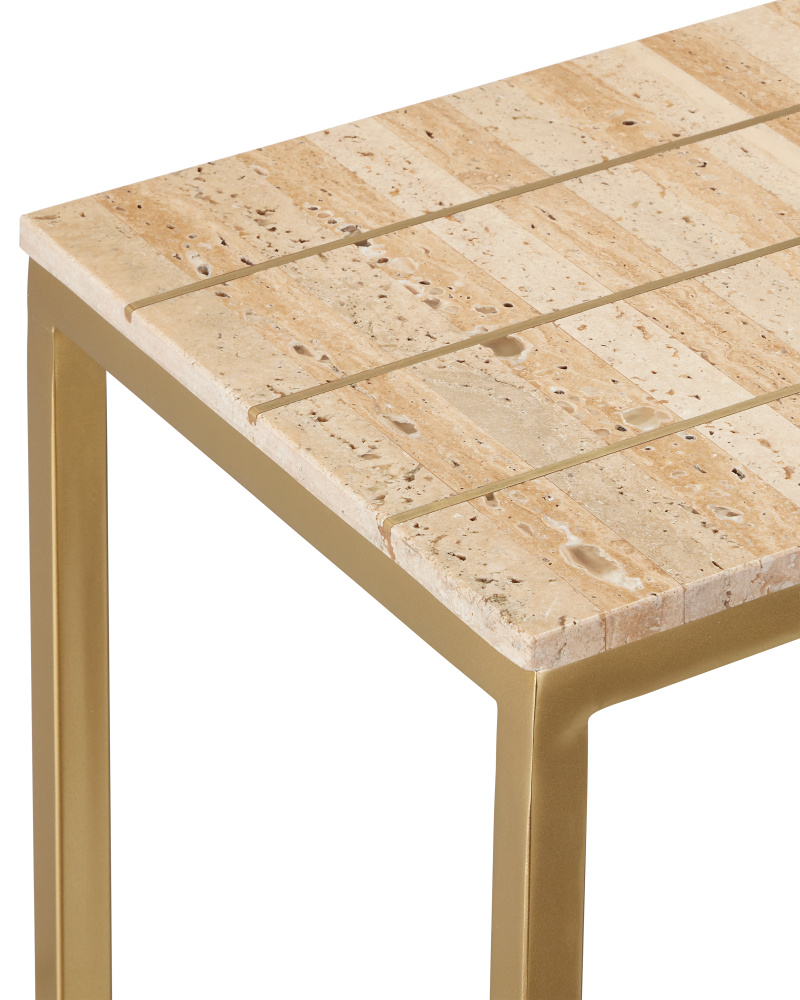 The Dezi C Table has a top set with natural travertine tiles arranged in a stacked dark-and-light pattern with lines of brass inlay running throughout. The effect of the intermingling of materials is a pop of brightness as the natural light shines on the metal and a hint of warmth as the stone absorbs it. The top on the gold cantilevered table is supported by a clean-lined frame made of iron that rises from a slightly smaller base.