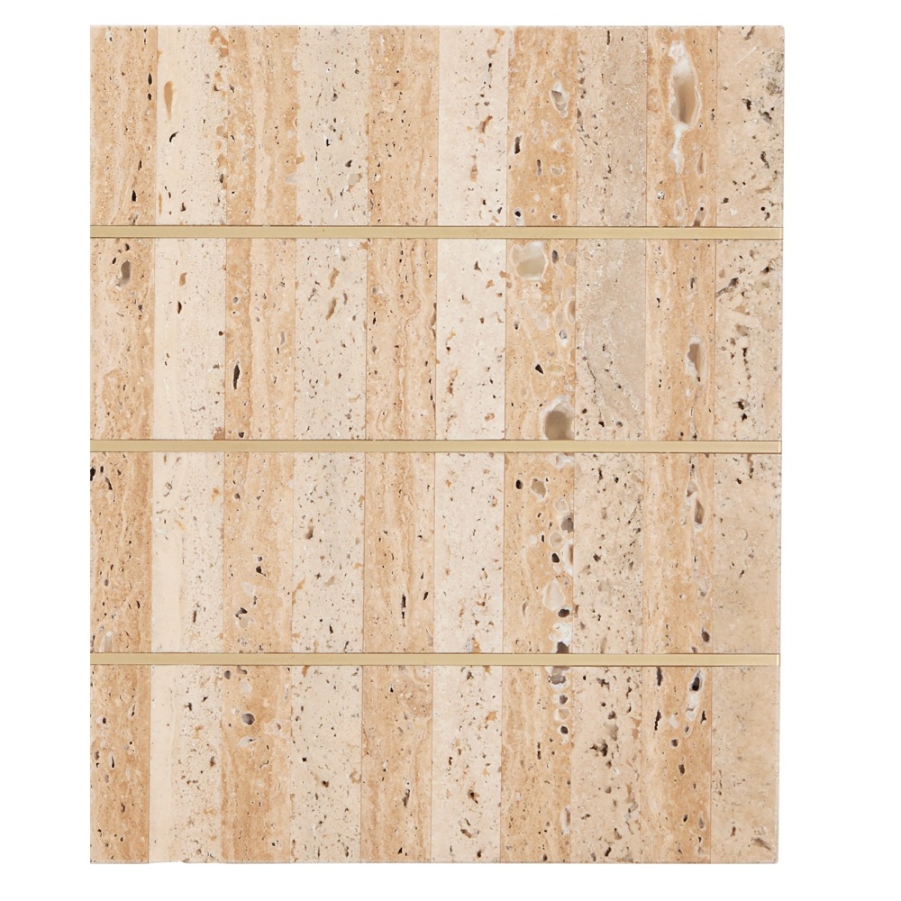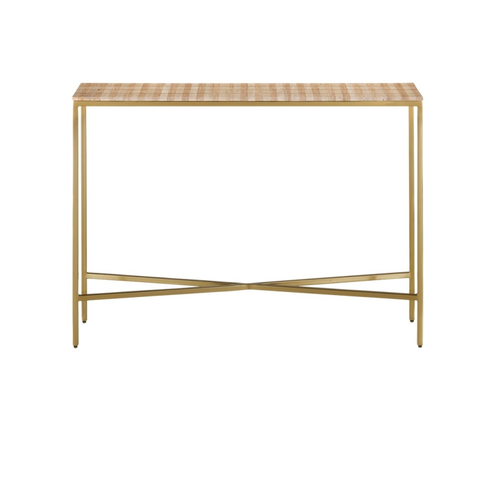 The Dezi Console Table has a top set with natural travertine tiles arranged in a stacked dark-and-light pattern with lines of brass inlay running throughout. The effect of the intermingling of materials is a pop of brightness as the natural light shines on the metal and a hint of warmth as the stone absorbs it. The top on the gold console table is supported by clean-lined legs that are made of iron and connected by an x-shaped stretcher.