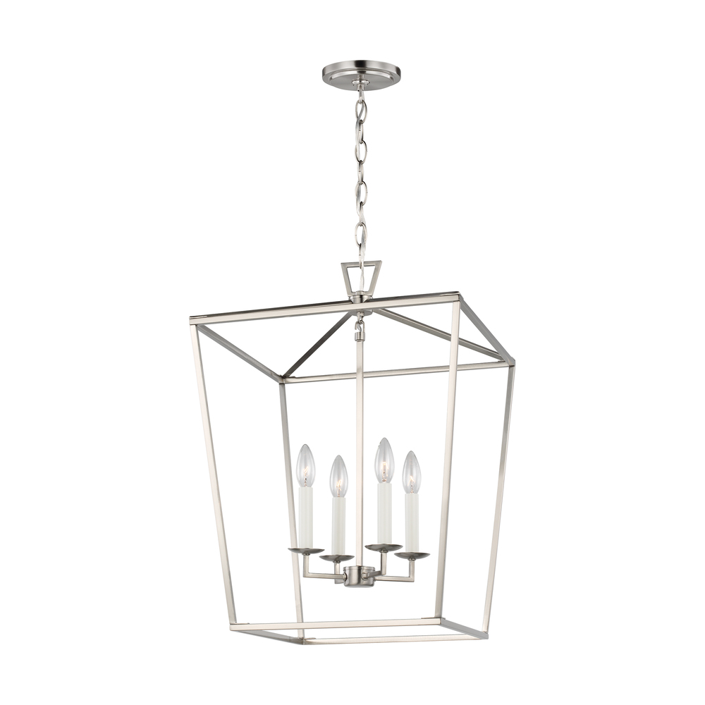 The Dianna contemporary lantern pendant by Visual Comfort Studio is offered in the Midnight Black, Satin Bronze or Brushed Nickel finish. The dark and transitional open frame encompass generously proportioned candelabra style bulbs. This updated silhouette brings a modern element to your cozy ambient lighting design.
