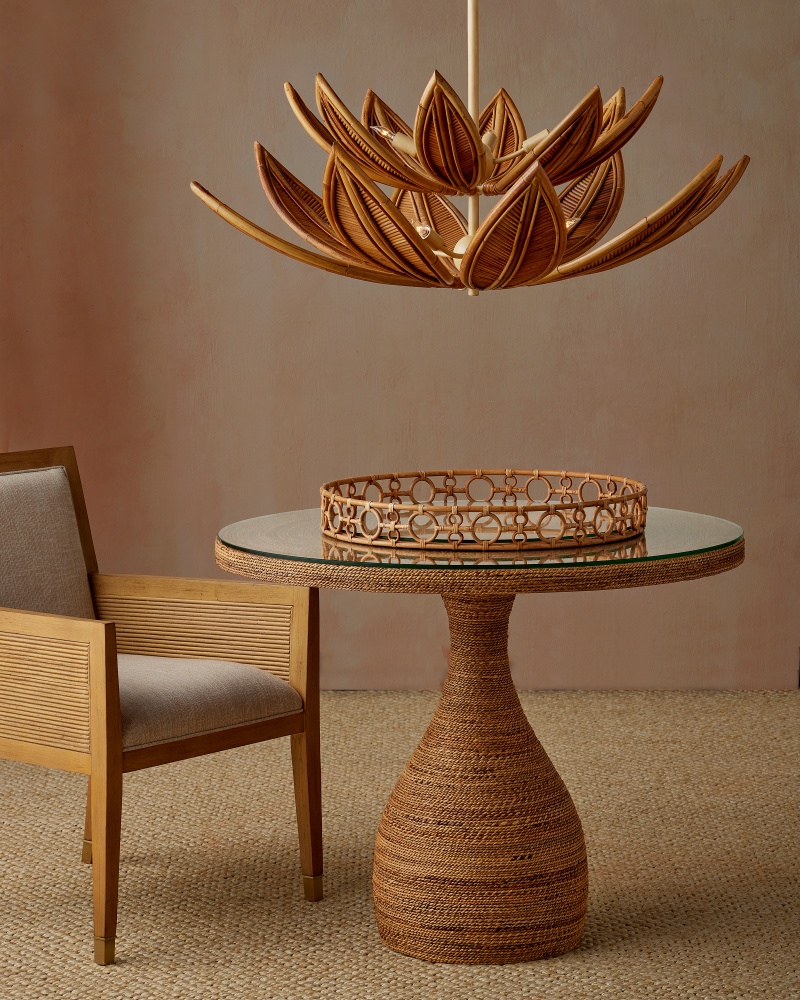 The Dominican Entry Table makes a striking first impression with its sculptural silhouette. Shaped like an inverted wine glass, the round foyer table is meticulously wrapped in abaca rope, showcasing artisanal craftsmanship and highlighting the organic texture of the material. The clear glass top provides a smooth surface while allowing the intricate weaving beneath to remain visible. This artisanal piece will anchor an entryway with warmth and sophistication.