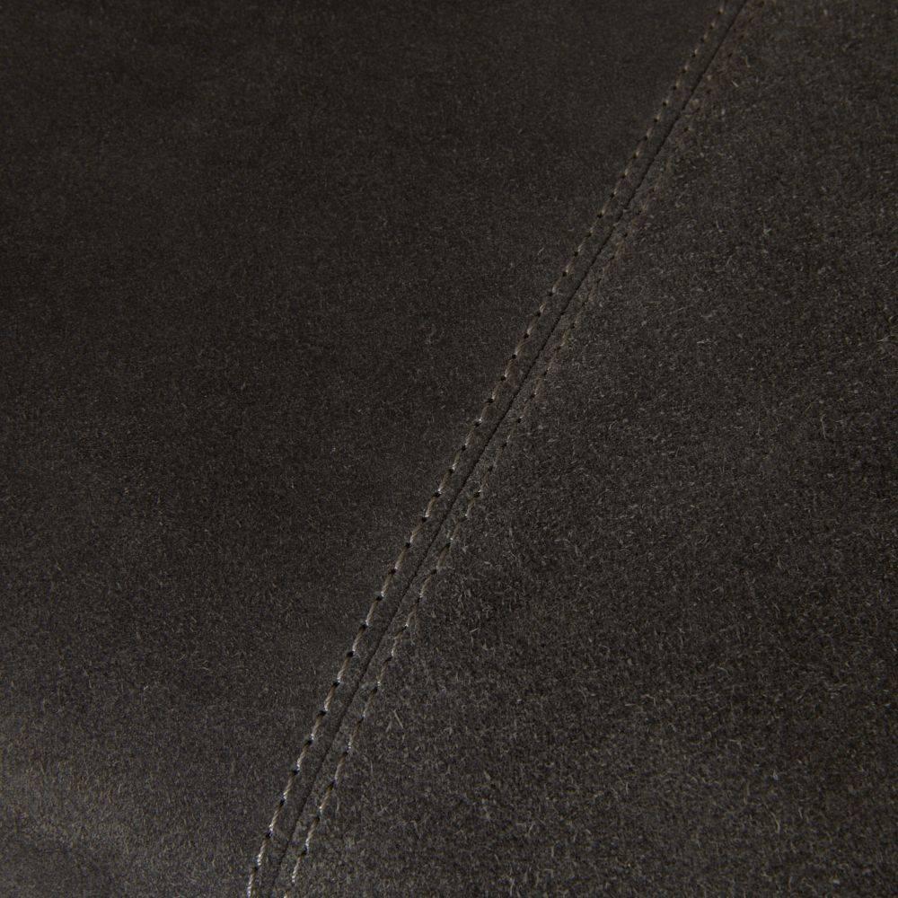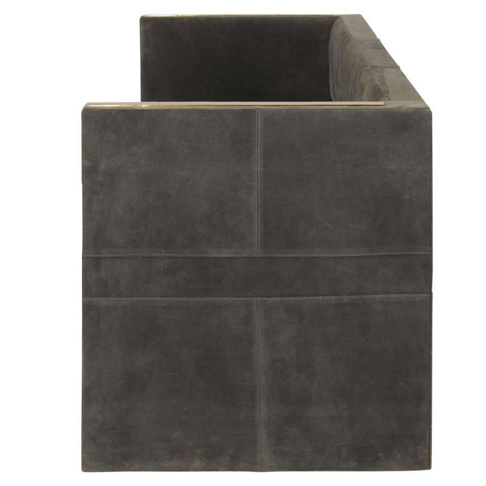 Masculine and modernist, the simple lines of this settee form an intriguing counterpoint to its luxe materiality. Stitching details on upholstered panels of slate grey suede align with the seat to add visual depth. Accented at each arm with antique brass “elbow patches” for contrast and durability. Suede will vary.