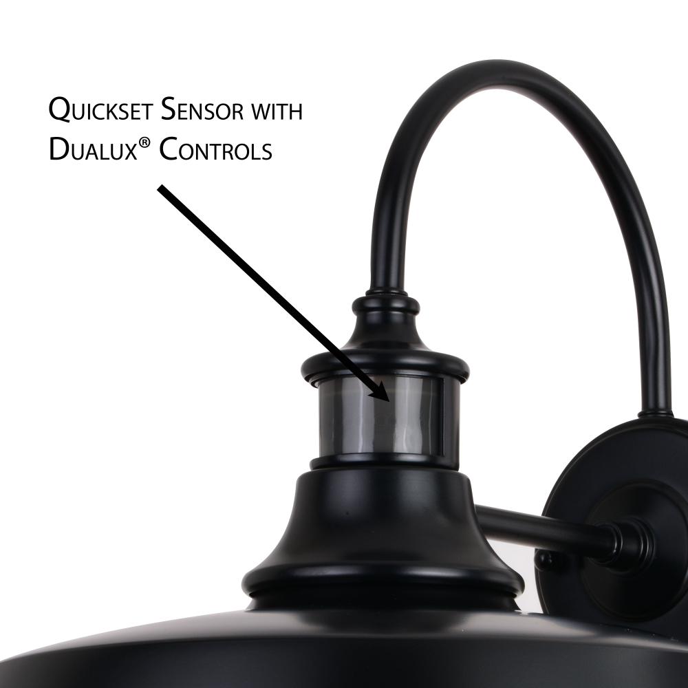 Modern farmhouse never looked so good as in the Dorado collection. Large open shades offer the maximum light output in your space. This outdoor wall light is ideal for your covered porch, entryway, garage, or any other area of your home. Dualux patented dual-level security lighting is outdoor lighting made smarter - brighter light at dusk, dimmer at night, brightening instantly when it detects motion. Designed to reliably and effortlessly enhance your home's beauty, security and efficiency from dusk to dawn with its built in motion sensor and photocell. This fixture works with any dimmable incandescent or halogen bulb and most dimmable LED bulb models. This decorative outdoor security light is designed to enhance the beauty, safety, and efficiency of your home.