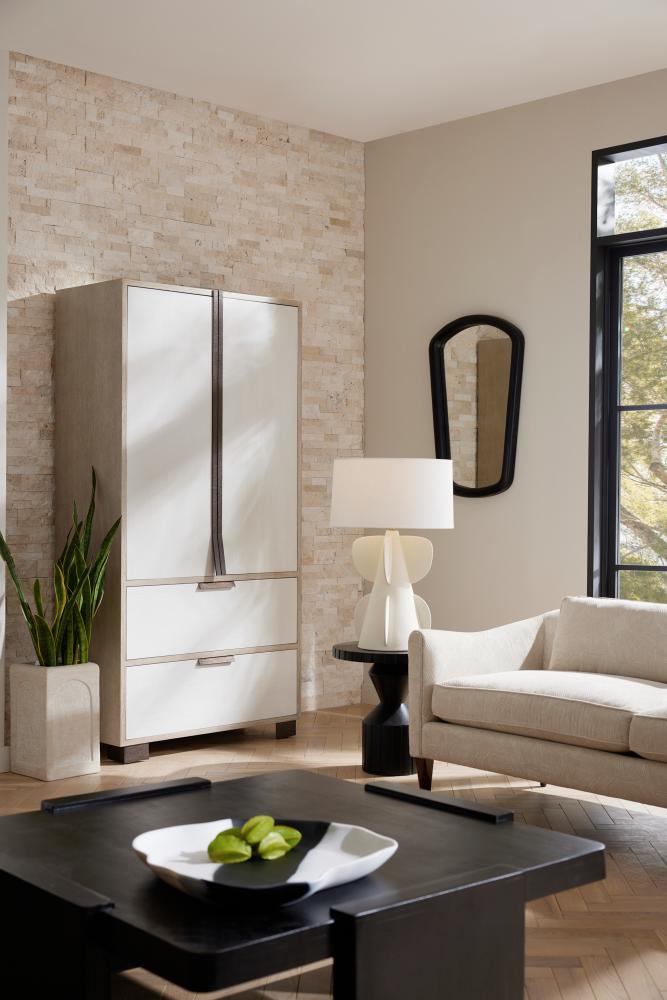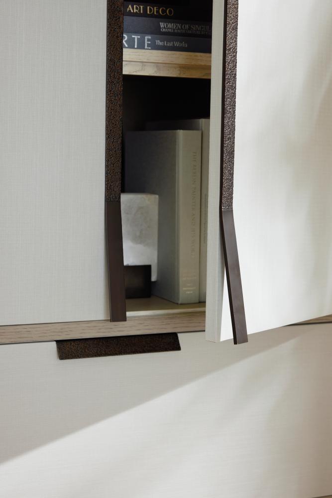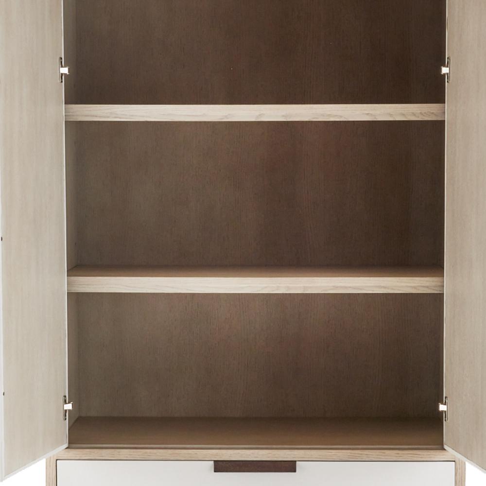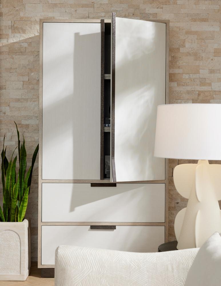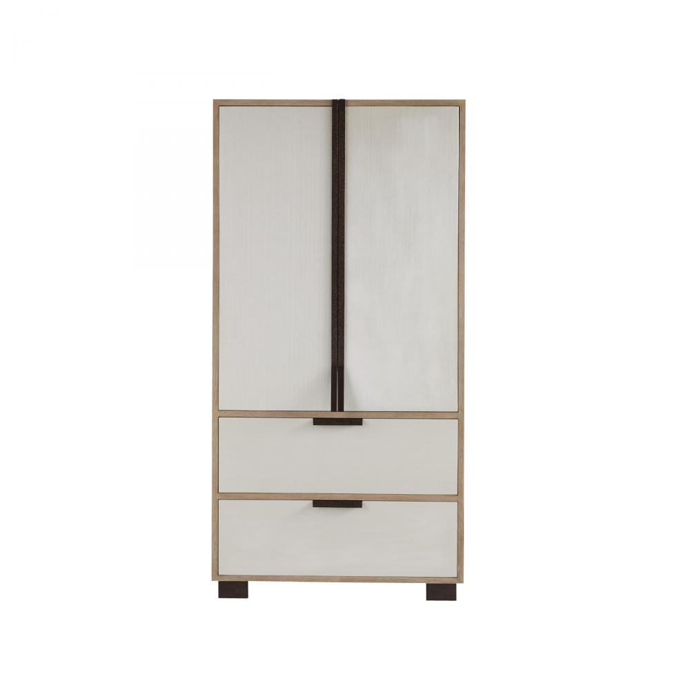 Our Dorsey features a stepped profile and soothing palette. Framed by smoked oak veneer, beige seagrass cloth doors open on European hinges to reveal two adjustable shelves. Accented with hammered iron bronze pulls, this simple storage also features two soft-closing drawers. Finish will vary.