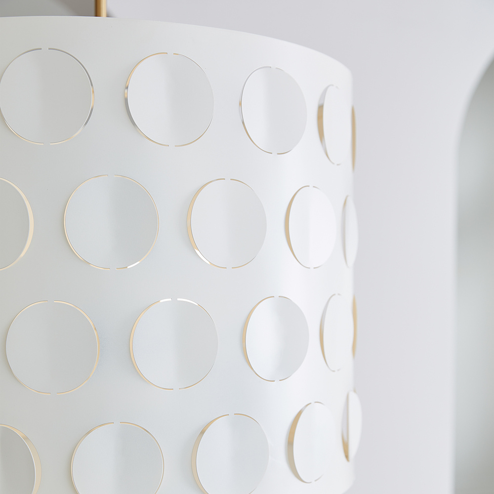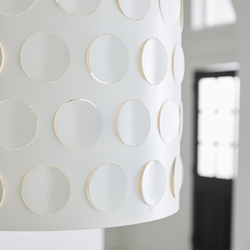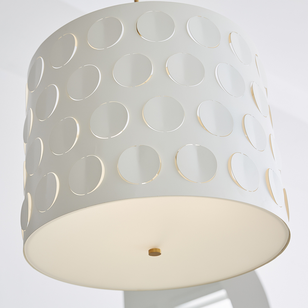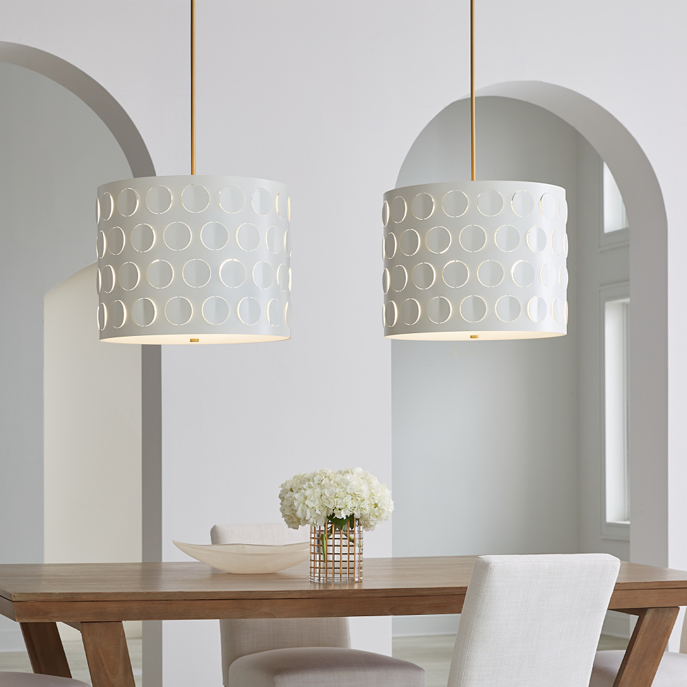 Dots are iconic to the kate spade brand—a simple and playful graphic motif. Dottie takes an iconic kate spade dot motif and cuts it into metal—creating a playful ambient light effect. A classic metal drum shade with an extra twist of perforated pattern. Use this fixture in place of any classic drum shade application, above a dining table, in a nook, or above an island.