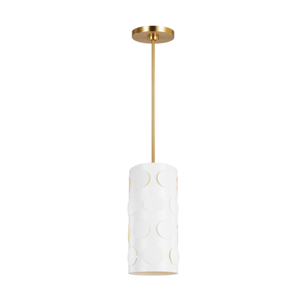 A cheerful, modern take on the classic pendant, this fixture is crafted of steel and a matte white motif design with burnished brass accents.