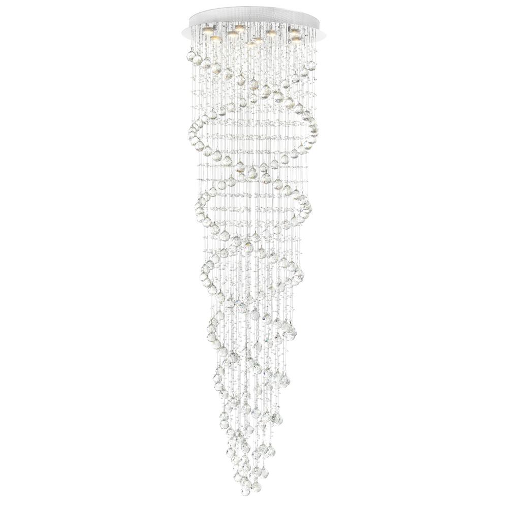 This breathtaking Double Spiral 24'' 9-Light Flush Mount with Chrome Finish is a show-stopping centerpiece that embodies modern glamour and elegance. Adorned with precision-cut clear crystal strands, two of which spiral downward in graceful symmetry, this fixture turns any large space into a luxurious setting. The chrome flush mount base holds nine GU10 bulbs (not included), ensuring bright and efficient illumination. Ideal for foyers, staircases, or living rooms with high ceilings, this chandelier delivers sophisticated brilliance with a contemporary twist. Finish: Chrome Light Count: 9 Light Source: GU10 Base (Bulbs Not Included) Adjustable Hanging Height: N/A (Flush Mount) Material: Metal, Crystal Style: Modern / Glam / Luxe