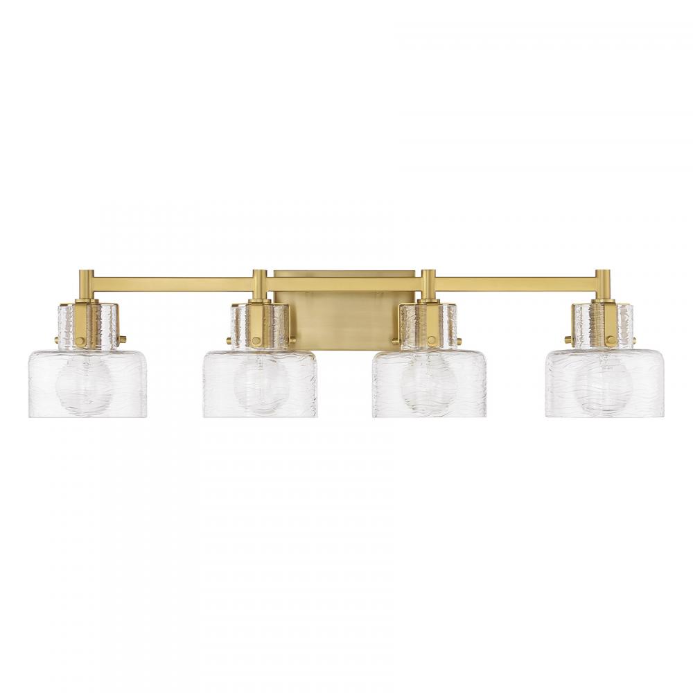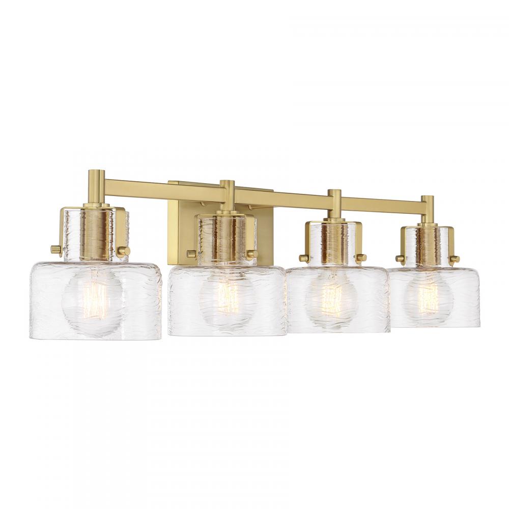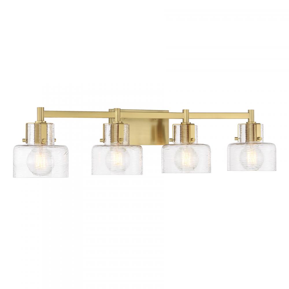 The Savoy House Dover 4-light bath light showcases standout bathroom lighting style! Clear glass shades feature a beautifully textured pattern that recalls ocean waves. These glass shades are held to the base by arms that are finished in Warm Brass and decorated with visible hardware to add a hint of vintage inspiration. Dover is 8.25" in height, 33.25" in width and extends 7.5" from the wall. It uses four standard size bulbs of up to 60 watts per bulb. Bulbs not included. Install as pictured. This bath bar is damp area rated.